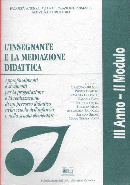 L'insegnate e la mediazione didattica - Approfondimenti e strumenti per la progettazione e realizzazione di un percorso didattico nella scuola dell'infanzia e nella scuola elementare. - Facoltà Scienze della Formazione Primaria attività di tirocinnio. - Biraghi G., Bosello P., Colombo E., Fava S., Oppici M., Meda L., Radogna A., Sironi S., Volta M.Pubblicazioni I.S.U. Università Cattolica - 2003Brossura - 17x24 cm - 183 pp.Libro nuovo leggeri segni del tempo