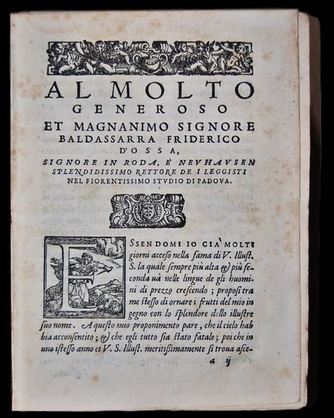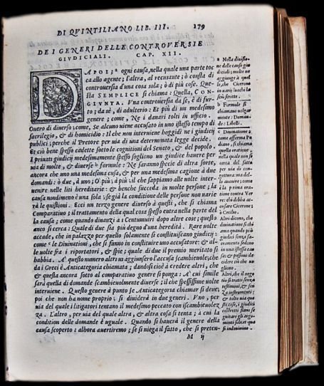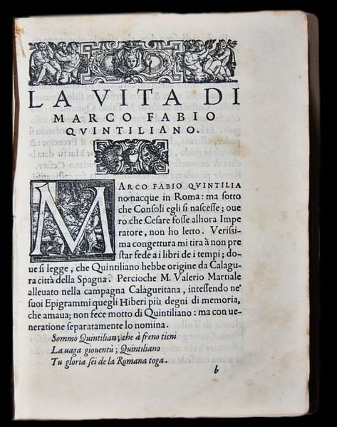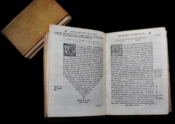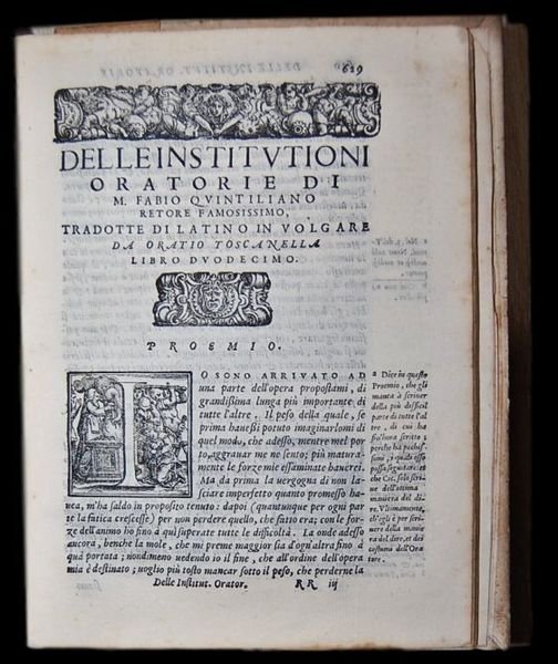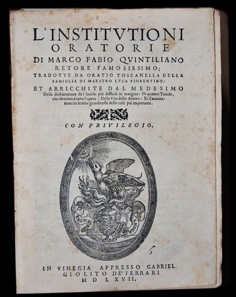 In 4° (); (40), 679, (1) pp. Legatura in cartoncino molle seicentesco con titolo manoscritto da mano coeva al dorso. Piccola e leggera brunitura al margine basso delle ultime 4 carte. Una ventina di carte leggermente ed uniformemente brunite a causa della qualità della stessa e nel complesso esemplare in buone-ottime condizioni di conservazione. Stemma xilografio di Giolito al frontespizio con fenice tra le fiamme che si sprigionano da unanfora,con la testa volta al sole con motto Vivo morte refecta mea; Semper eadem, la fenice è ripetuta anche allultima pagina.Titolo e autore chiosati da mano coeva in elegante grafia ai tagli. Bellissima veste grafica con testatine, finalini e grandi iniziali xilografiche ornate ed animate. Seconda edizione dei Giolito di questo classico latino del grande oratore e maestro di retorica Marco Fabio Quintiliano (latino: Marcus Fabius Quintilianus; Calagurris Iulia Nassica, 35-40 d.C. Roma, 96 d.C.) nella traduzione dellumanista Orazio Toscanella celebre volgarizzatore di classici latini. Quintilaino fu autore di diverse opere ma Il suo capolavoro dedicato allamico Vittorio Marcello, funzionario della corte di Domiziano, per leducazione del figlio Geta è lInstitutio oratoria (90-96 d.C.), cioè la formazione delloratore e del futuro uomo politico, che compendia lesperienza di un insegnamento durato ventanni (dal 70 al 90 ca). Scopo di questopera è fungere da manuale per coloro che vogliano impegnarsi nellars oratoria ma la Institutio oratoria è anche un trattato denso di insegnamenti pedagogici e suggerimenti didattici. Qui propone una pedagogia illuminata e innovativa, correggendo il modello tradizionale. Per esempio è contrario alle punizioni corporali, considerandole controproducenti al processo educativo. Poi ha una attenzione particolare nei confronti delle inclinazioni personali e proprie del bambino. La pedagogia si basa su un processo sistematico, che non si sviluppa per assaggi o frammenti ma si basa su una programmazione ben precisa e congegnata, per questo definita enciclopedica, che punta cioè alla formazione generale dellallievo. È un metodo graduale, che procede dal più semplice al più complesso, dal generale alla definizione e continuo perché non ha un inizio e una fine ma dovrebbe durare tutta la vita. In questo lavoro interagiscono, oltre che leducatore, lalunno stesso, la scuola (che è una sorta di piccola società), la famiglia. Quintiliano riconosce nella figura materna un ruolo fondamentale nella formazione del bambino: la madre, nei primi anni di vita del figlio, deve impegnarsi il più possibile a parlar bene, in modo corretto, per far sì che non si creino lacune a livello linguistico già in tenera età. È concezione rivoluzionaria per certi punti di vista, in quanto la figura della donna era poco considerata, per quanto concerne questi compiti. È definita una pedagogia perfettiva: Quintiliano pensa e crede che ogni bambino possa diventare come Alessandro il Macedone, cioè la perfezione. Una figura da ammirare, per le sue gesta e soprattutto perché fu allievo di Aristotele (uno dei punti di riferimento di Quintiliano). Seneca invece criticò questo aspetto, perché riteneva limmagine di Alessandro Magno totalmente immorale, spregiudicata, diseducativa, un brutto esempio da seguire in quanto il peggior modello di persona e di condottiero. È una pedagogia della parola: vero che afferma che il bambino possa diventare tutto ciò che desideri, qualsiasi tipo di persona, però lobbiettivo finale della pedagogia proposta da Quintiliano è quella di formare il perfetto oratore. Il testo integrale dellopera, conosciuto solo in parte nel Medioevo, si deve alla scoperta di Poggio Bracciolini. Raro. Cfr.: IT\ICCU\RMLE\001811.