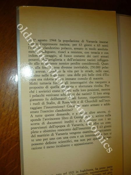 DESCRIZIONE: Mursia Milano 1978 I^ Ed. br. ed. ill. a colori con alette, pp. 221 21 ill. b/n f.t., in 8°. Il 1° agosto 1944 la popolazione di Varsavia insorse contro loppressione nazista. Per 63 giorni e 63 notti lesercito clandestino polacco, armato in modo assolutamente inadeguato, riuscì a resistere al fuoco costante dellaviazione e dei carri armati tedeschi. Quando, alla fine, la resa divenne inevitabile, il bilancio si rivelò tragico: 250.000 polacchi morti e una delle più belle città dEuropa ridotta a un cumulo di macerie. Una rivolta disperata e sfortunata che nasconde ancora oggi molti interrogativi: perché i sovietici non intervenirono? Quali furono i ruoli di Stalin, Churchill, Roosevelt? Chi armò e addestrò lesercito clandestino? A queste domande Bruce risponde con una ricostruzione dei fatti basata su documenti inediti e testimonianze orali, in una sorta di diario giorno per giorno del martirio di Varsavia .CONDIZIONI: Ottime, sovracc. leggermente usurata. PESO / WEIGHT: 400 gr. without package