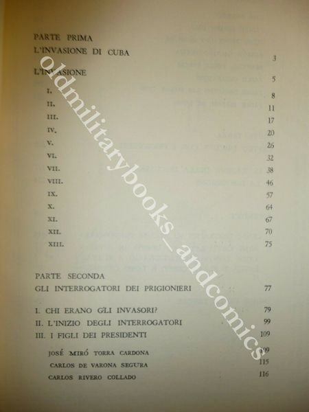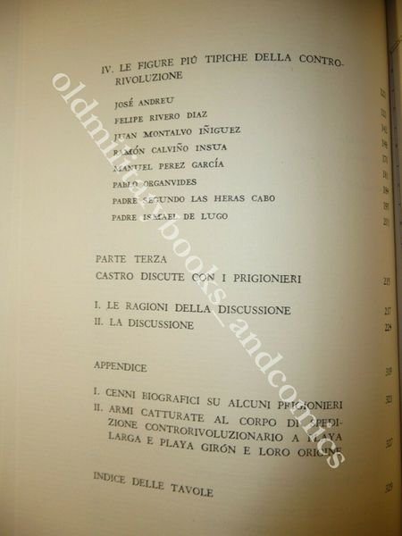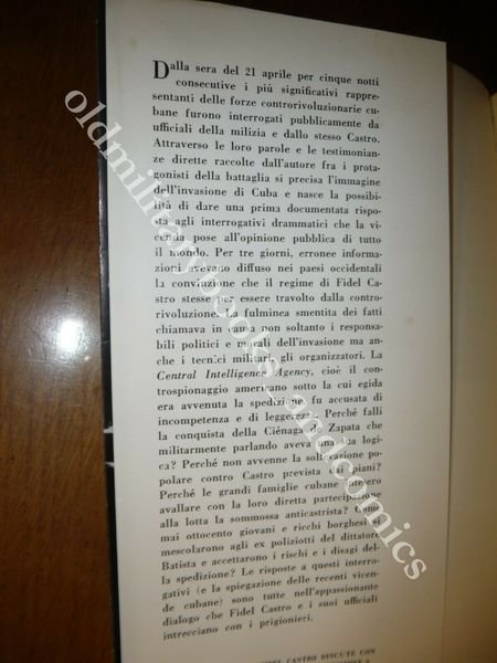 DESCRIZIONE: Parenti Ed. Firenze 1961, br. ed. con sovracc. ill. col. ed acetato trasparente con fascetta ed., pp. 326 alcune ill. b/n f.t. in 8°. Comprende gli interrogatori dei prigionieri della fallita rivolta anticastrista. Interrogatori, testimonianze, considerazioni dopo il fallimento dell'invasione di Cuba. CONDIZIONI: Ottime/Perfette. PESO / WEIGHT: 450 gr. without package
