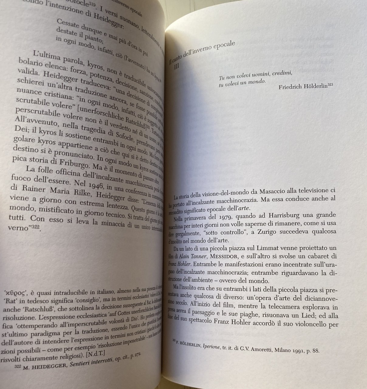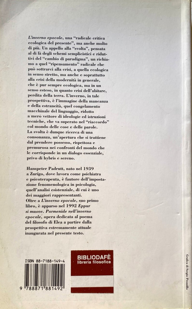 L'inverno epocale, una radicale critica ecologica del presente, ma anche molto di più. Un appello alla svolta, pensata al di là degli schemi semplicistici e riduttivi del cambio di paradigma, un richiamo a quel ripensamento radicale che può sottrarci alla crisi, a quella ecologica in senso stretto, ma anche e soprattutto alla crisi della modernità in generale, che è pur sempre ecologica, ma in un senso esteso, in quanto crisi dell'abitare, perdita della terra. L'inverno, in tale prospettiva, è l'immagine della mancanza e della estraneità, quel congelamento macchinale del linguaggio, ridotto a mero vettore di ideologie ed istruzioni tecniche, che va superato nel riaccordo col mondo delle cose e delle parole. La svolta è dunque ricerca di una consonanza, un'apertura che si trattiene dal prendere possesso, rispettosa e premurosa nei confronti del mondo che le corrisponde in un dialogo essenziale, privo di hybris e sereno.