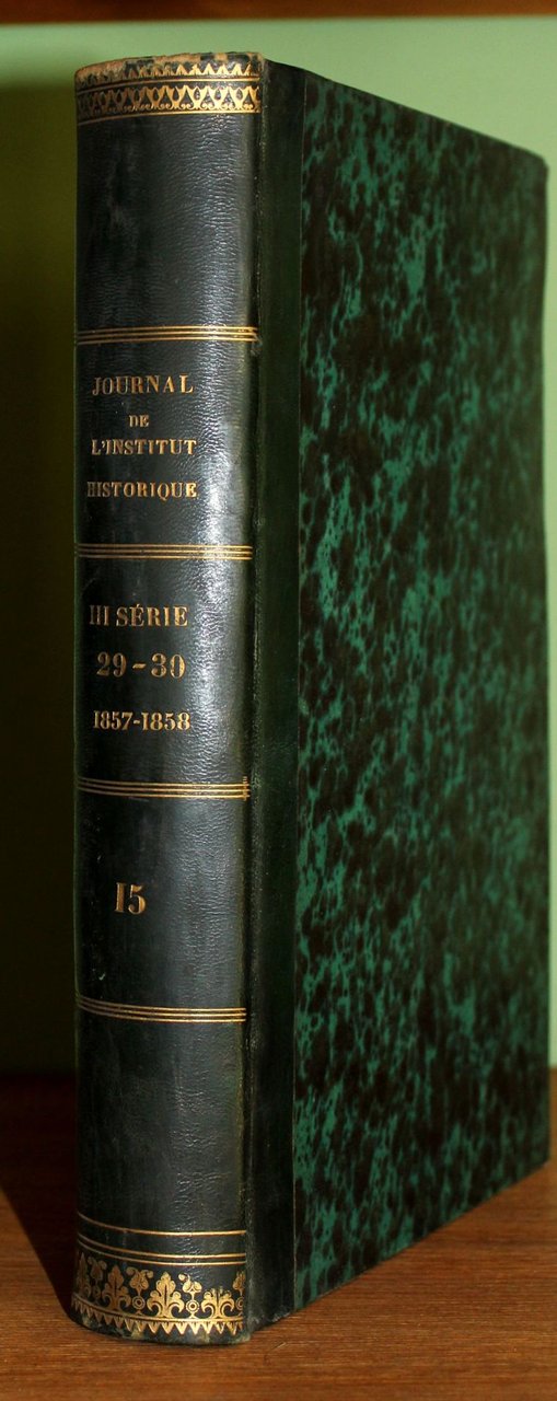 Due tomi in un volume in 8°, pp. 384; 384. Mezza pelle dell'epoca. Dorso liscio con titoli e filetti oro. Copia in buono stato. Fra i vari saggi segnaliamo: BERRY. Études historiques sur les familles consulaires romaines (in diverse parti). - VALLET DE VIRVILLE. Charles VII, Roi de France, et ses conseillers. Index général alphabétique (in diverse parti).