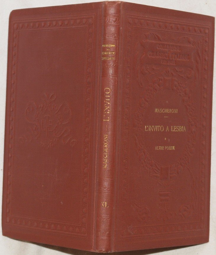 In 16. Dim. 18,5x12,5 cm. Pp. 152+(4). Edizione del 1927 della serie "Collezione di classici italiani con note" della nota opera poetica del matematico e letterato italiano Lorenzo Mascheroni (1750-1800) L'opera poetica "L'invito di Dafni Orobiano a Lesbia Cidonia" è un'epistola pubblicata nel 1793 con cui il poeta invita la contessa Paolina Secco Suardo Grismondi a visitare le collezioni di storia naturale ei gabinetti scientifici dell'ateneo pavese. Introduzione e commento di Giulio Natali. All'interno sono presenti tre planches fotografiche. Bella brossura editoriale in tela decorata. In buone condizioni. Brossura editoriale in tela con decorazioni in oro ed a secco ai piatti in ottime condizioni generali con lievi usure ai margini e dorso. Legatura in buone condizioni. All'interno le pagine si presentano in ottime condizioni con rare fioriture. Margine inferiore mancante al frontespizio. Edition of 1927 of the series "Collezione di classici italiani con note" of this poetical work by the italian letterate and mathematician Lorenzo Mascheroni (1750-1800). The poetical work "L'invito di Dafni Orobiano a Lesbia Cidonia" is a letter published in 1793 in which the poet invitates the countess Paolina Secco Suardo Grismondi to visit the collections of natural history and the scientiphic cabinets of the Pavia University. Introduction and comment by Giulio Natali. Inside there are three planches Beautiful editorial decorated cover. In very good conditions. Cloth editorial cover with golden and embossed decorations in the plates in very good general conditions slightly worn in the edges and spine. Binding in good conditions. Inside pages are in very good conditions with occasional foxings. Lower edge of the title page is missing.
