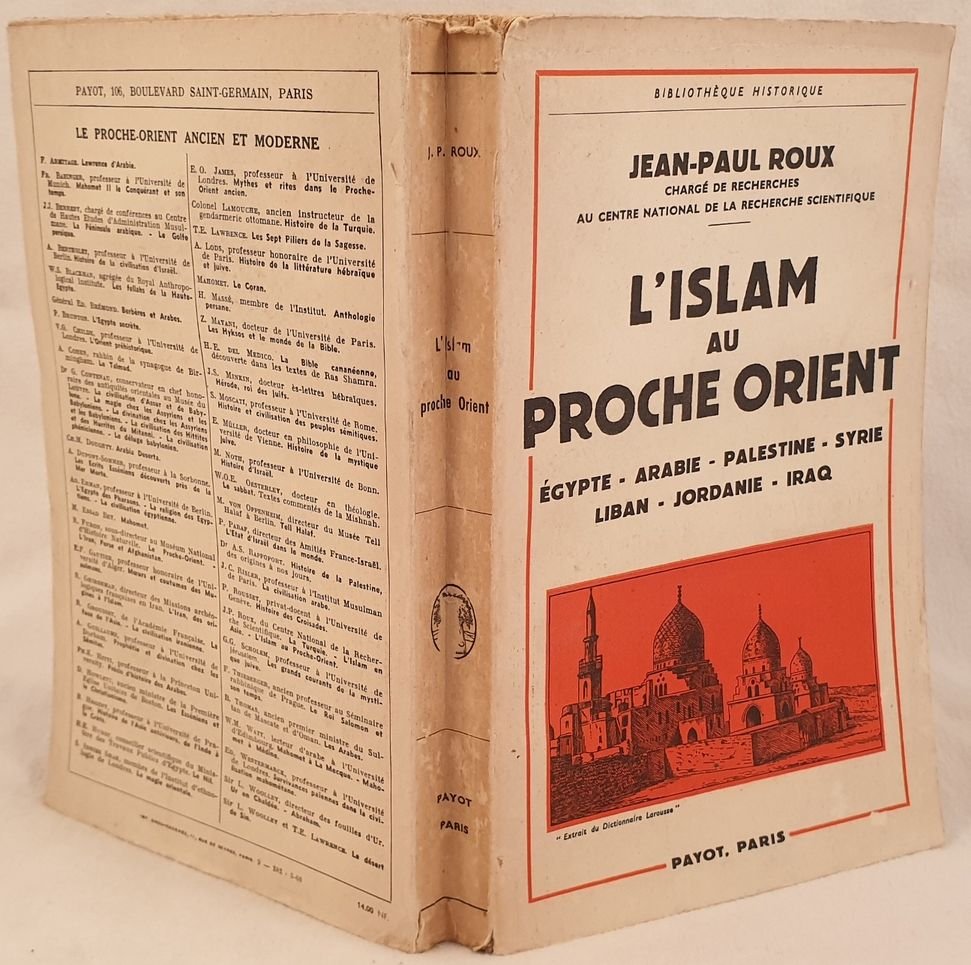 Edizione del 1960 di questa opera sull'Islam nel vicino Oriente scritto da Jean Paul Roux. All'interno islam in Egitto, Arabia, Palestina, Siria, Libano, Giordania e Iraq. In ottime condizioni. Copertina editoriale in ottime condizioni generali con lievi usure ai margini e dorso. Legatura in buone condizioni. All'interno le pagine si presentano in ottime condizioni con rare fioriture. In 8. Dim. 23x14,5 cm. Pp. 271+(1). Edition of 1960 of this work of Islam in Near East written by Jean Paul Roux. Inside islam in Egypt, Arabia, Palestine, Syria, Liban, Jordan and Iraq. In very good conditions. Editorial cover in very good general conditions slightly worn in the edges and spine. Binding in good conditions. Pages in very good conditions with occasional foxings. In 8. Dim. 23x14,5 cm. Pp. 271+(1).