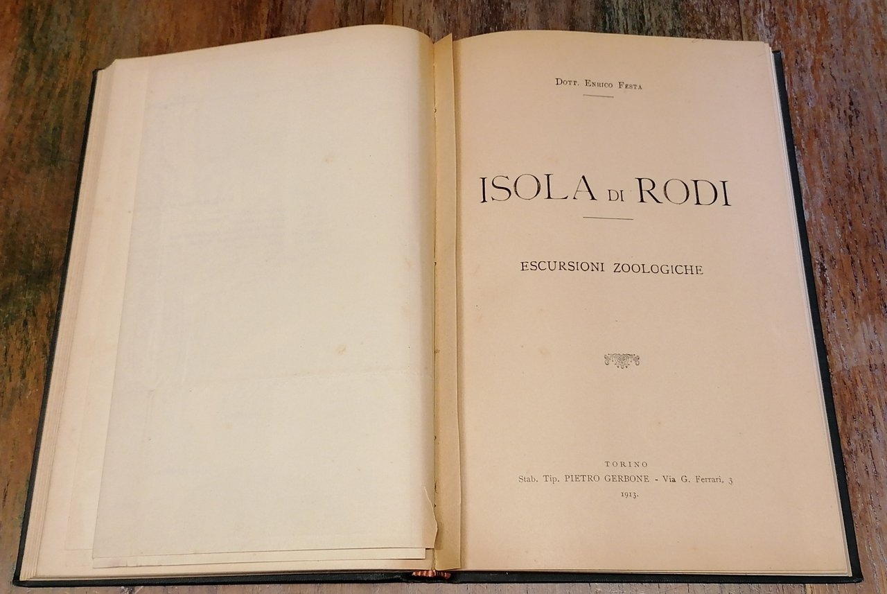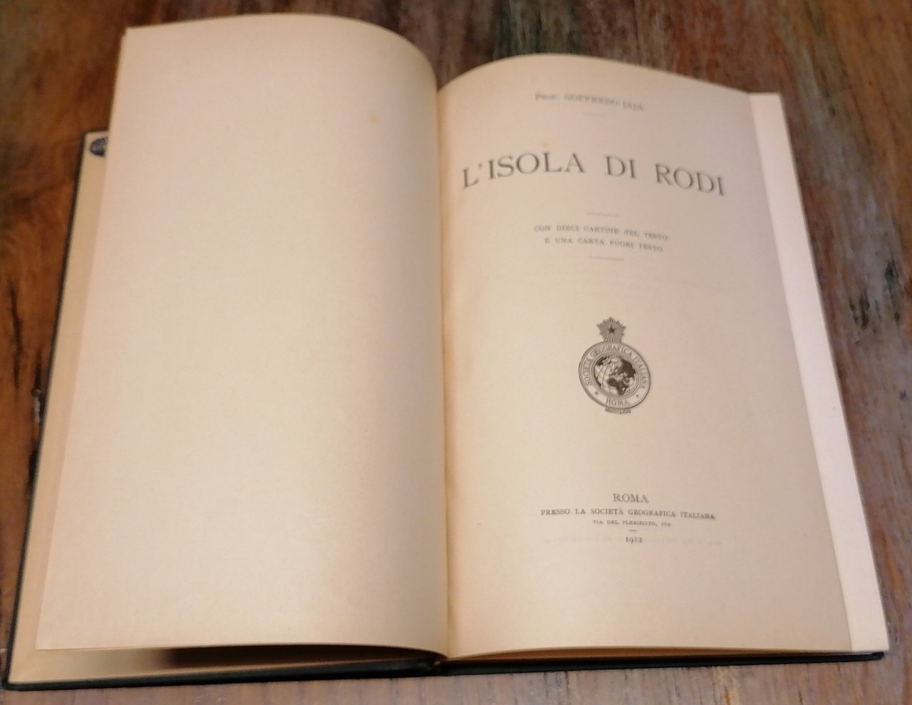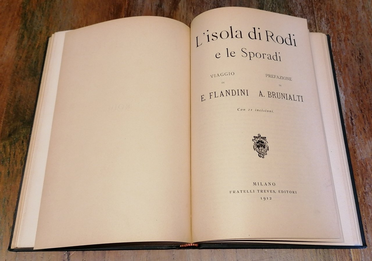 (Mediterraneo orientale - Dodecaneso - Isole Egee) Miscellanea di tre scritti riuniti in un solo tomo in 8°, legatura coeva in piena tela con titolo in oro al dorso. Goffredo Jaja "Isola di Rodi", Roma, presso la Società Geografica Italiana, 1912, pp. (2),130,(2), con 10 cartine nel testo ed una carta a colori più volte ripiegata fuori testo. Enrico Festa "Isola di Rodi. Escursioni zoologiche", Torino, Stab. Tip. Pietro Gerbone, 1913, pp. 30,(2), con 27 illustrazioni fotografiche in bianco e nero su tavole fuori testo. Eugenio Flandini (Eugène Flandin) "L'isola di Rodi e le Sporadi. Viaggio di E. Flandini. Prefazione di A. Brunialti", Milano, Fratelli Treves, 1912, pp. (2),93,(3), con 21 incisioni nel testo di cui 5 a doppia pagina. Non sono state conservate le brossure originali. Ottimo stato di conservazione.