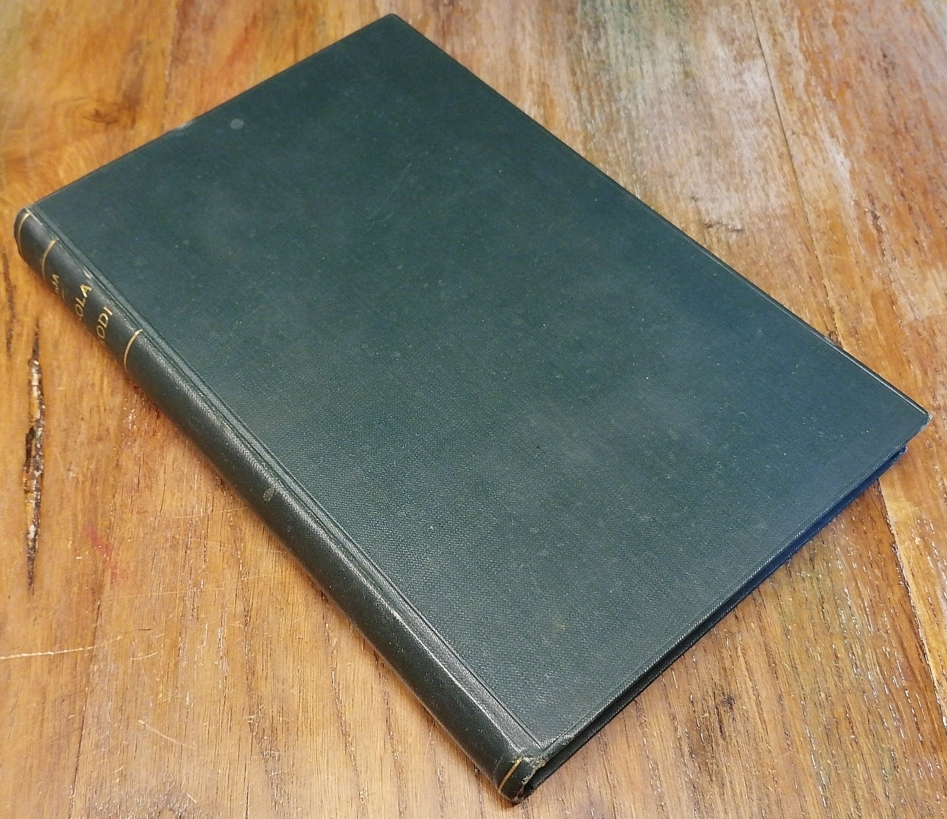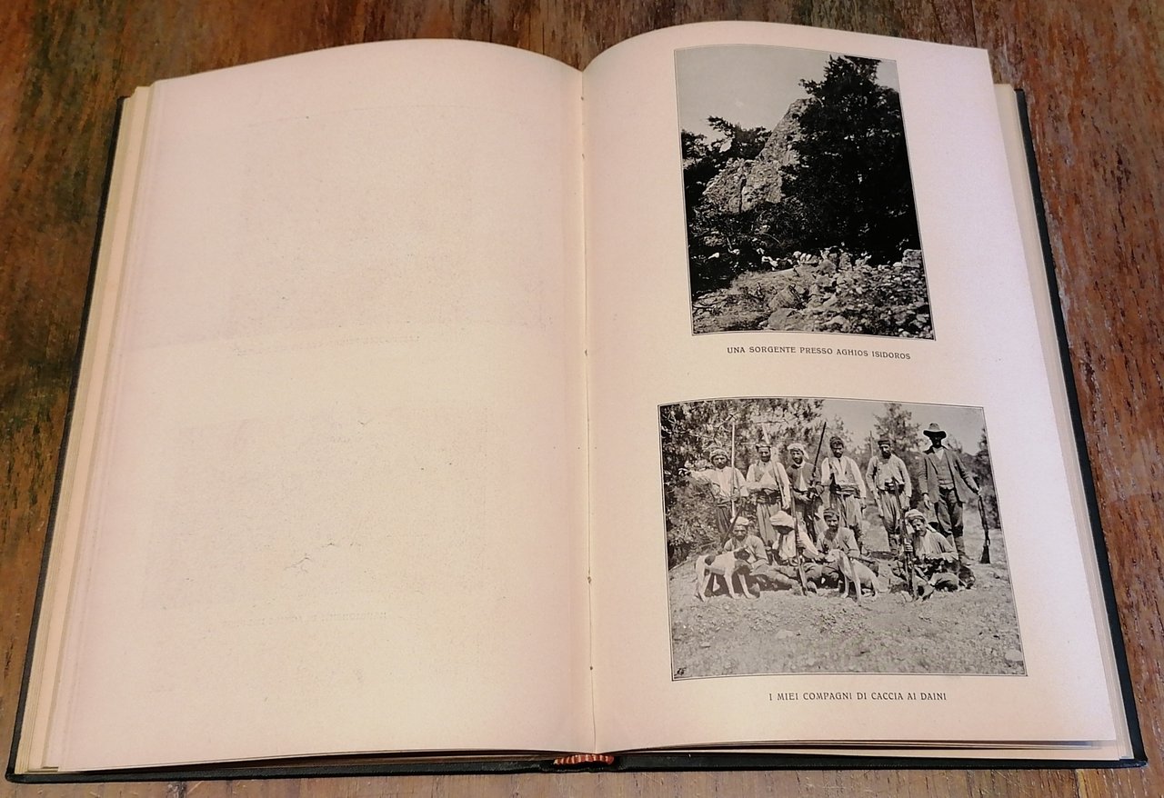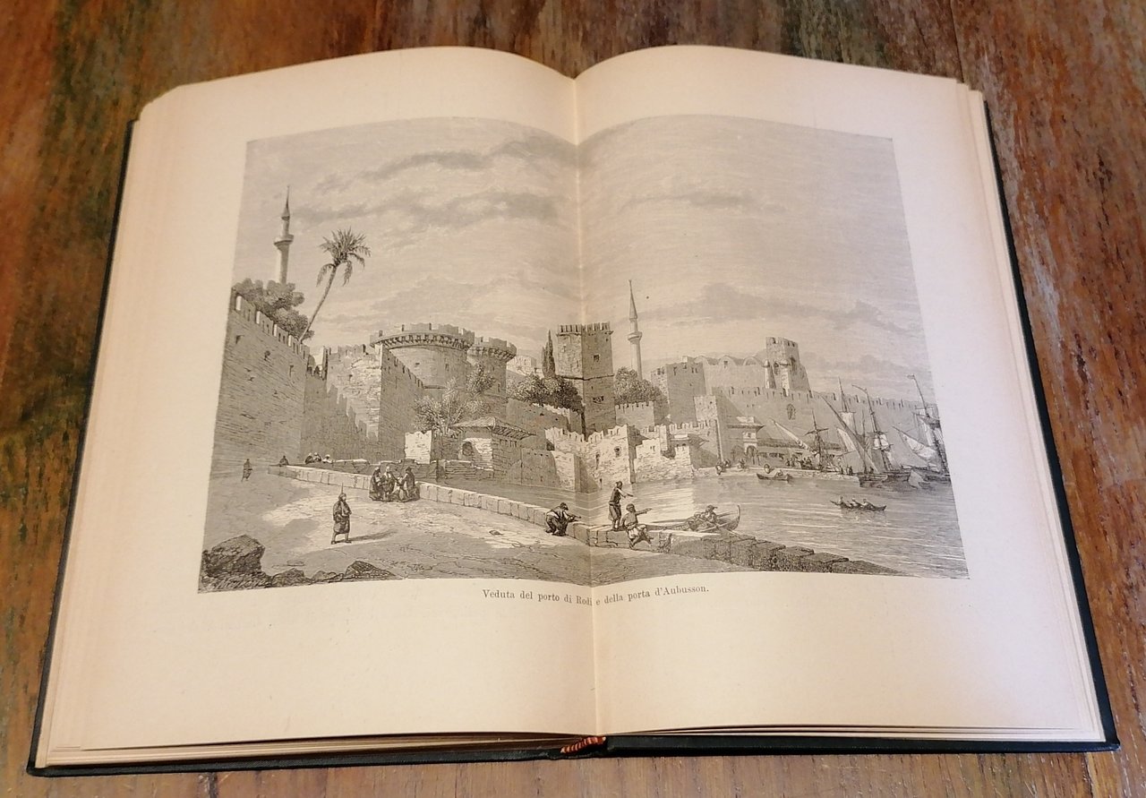 (Mediterraneo orientale - Dodecaneso - Isole Egee) Miscellanea di tre scritti riuniti in un solo tomo in 8°, legatura coeva in piena tela con titolo in oro al dorso. Goffredo Jaja "Isola di Rodi", Roma, presso la Società Geografica Italiana, 1912, pp. (2),130,(2), con 10 cartine nel testo ed una carta a colori più volte ripiegata fuori testo. Enrico Festa "Isola di Rodi. Escursioni zoologiche", Torino, Stab. Tip. Pietro Gerbone, 1913, pp. 30,(2), con 27 illustrazioni fotografiche in bianco e nero su tavole fuori testo. Eugenio Flandini (Eugène Flandin) "L'isola di Rodi e le Sporadi. Viaggio di E. Flandini. Prefazione di A. Brunialti", Milano, Fratelli Treves, 1912, pp. (2),93,(3), con 21 incisioni nel testo di cui 5 a doppia pagina. Non sono state conservate le brossure originali. Ottimo stato di conservazione.