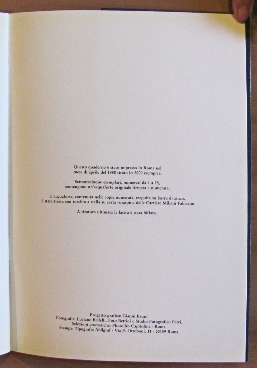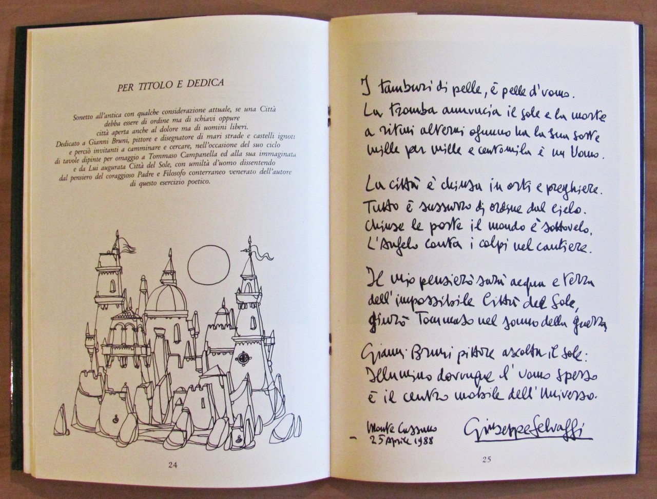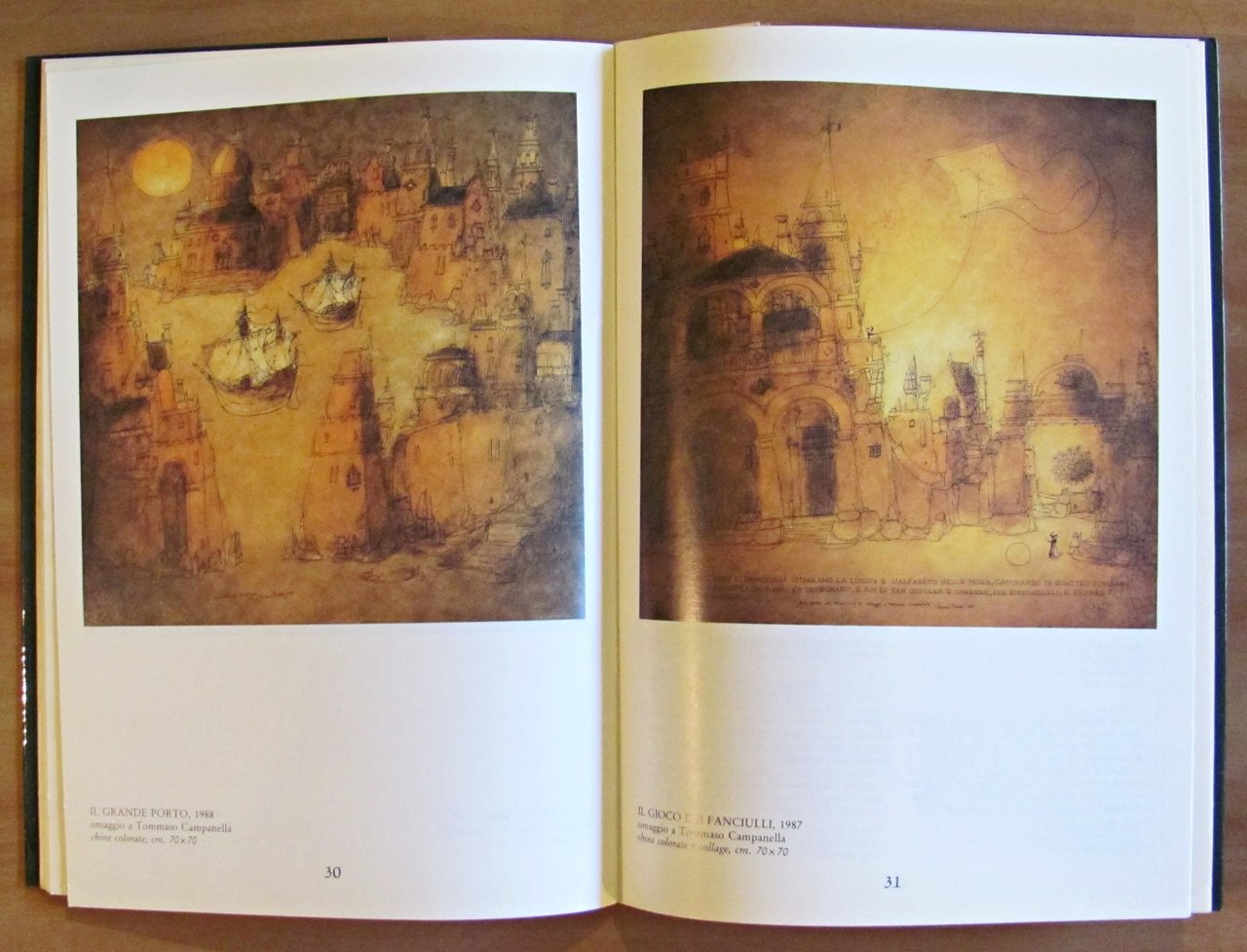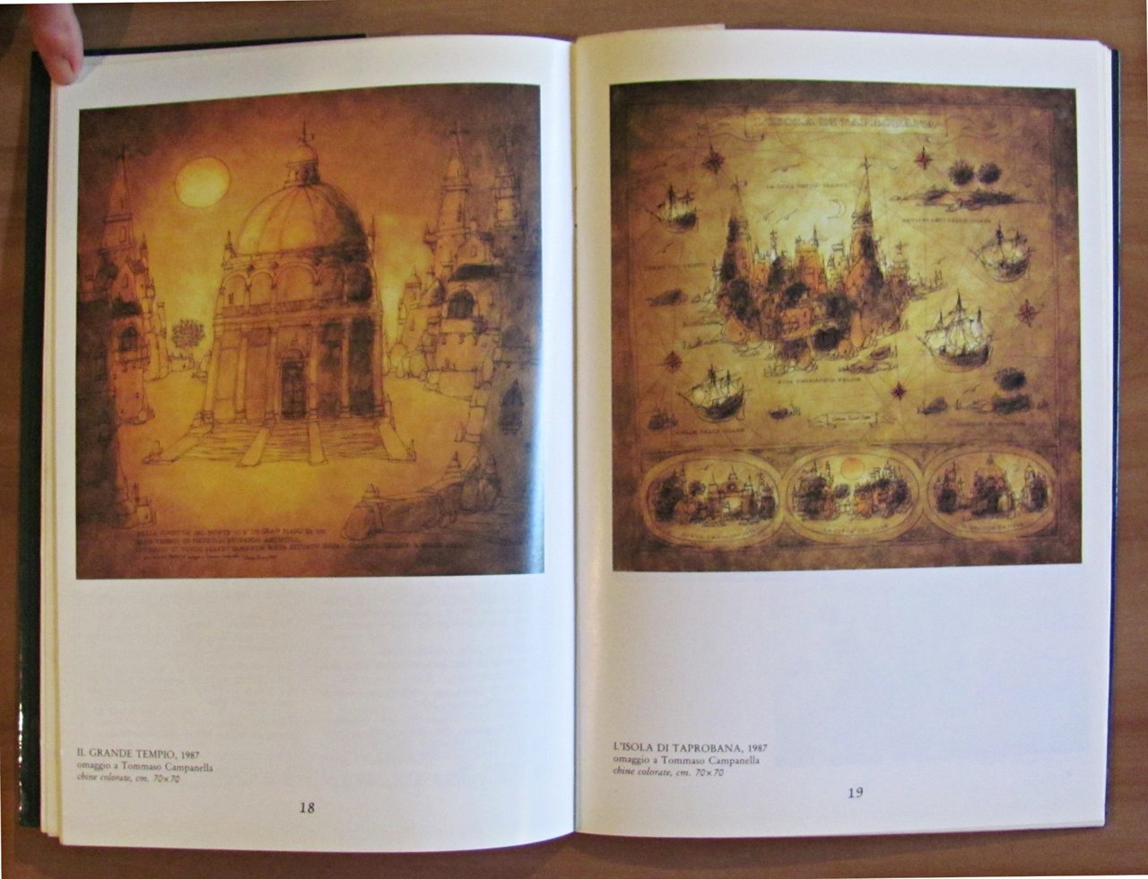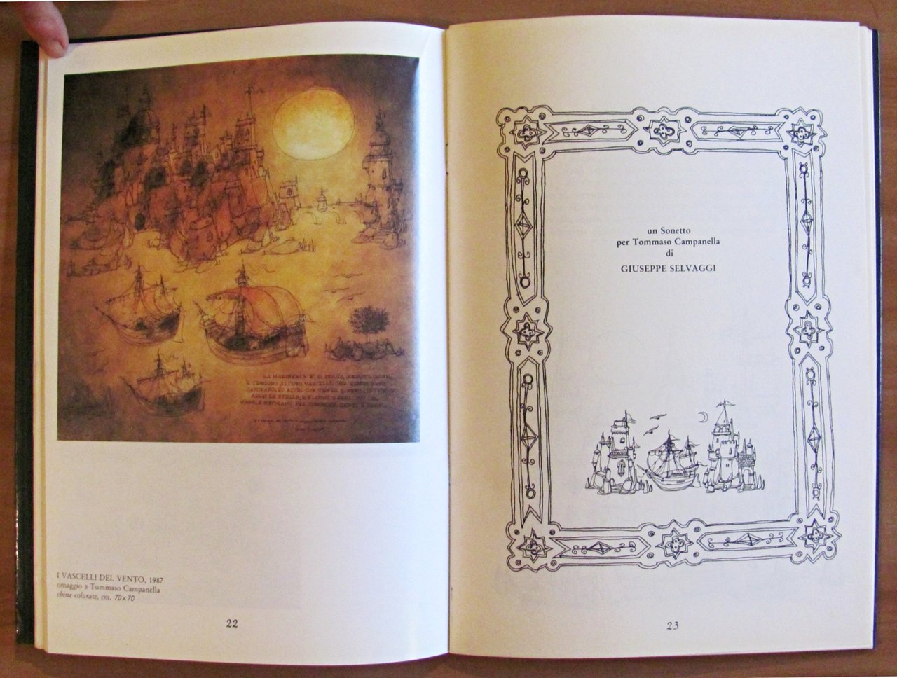 Collana Quaderni d'Arte Contemporanea. Immagini ispirate alla "Città del Sole" di Tommaso Campanella; Testo di Luigi Tallarico; con un sonetto di Giuseppe Selvaggi. Illustrazioni in b/n e a colori n.t., anche a piena pagina. Tiratura limitata a 2000 esemplari. Ed. Il Sole - Roma, I edizione 1988. Brossura editoriale muta con sovraccoperta originale. 21x30; pp.43. Ottimo stato. , Ottimo (Fine)