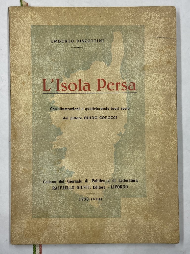 Brossura editoriale con sovraccoperta in pergamena vegetale illustrata ripiegata a busta sui piatti, cm 25x17, pp (10) 100 (6), con 2 tavole in nero e 5 in quadricromia di Guido Colucci. Edizione originale di questo odeporico della Corsica, dedicato dall’autore a Marinetti «in nome della passione italiana»; l’autore offre descrizioni accompagnate da notizie storiche e informazioni sulle condizioni degli italiani ad Aiaccio, Bonifacio, Corte, Evisa, Bastia ecc.