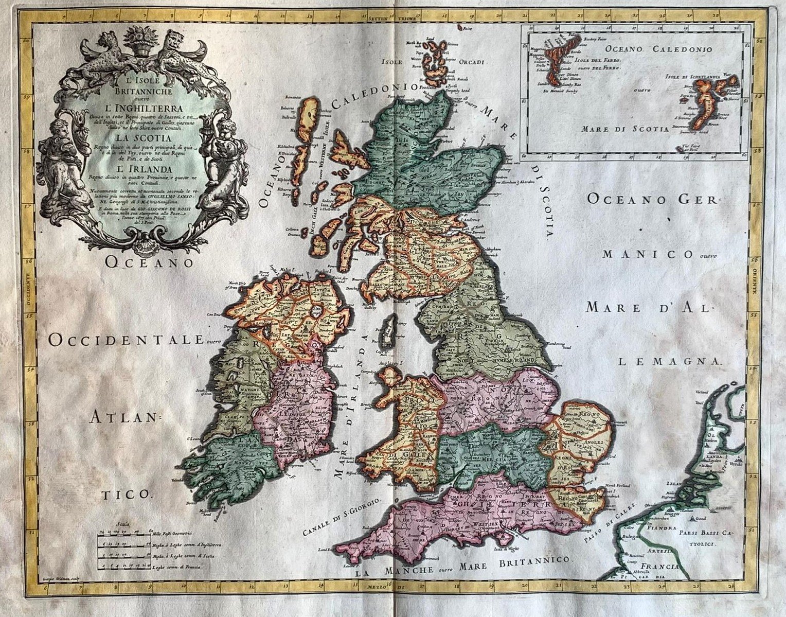 >Incisione originale in rame (mm 410x510 e margini) arricchita da bella colorazione, raffigurante l'Inghilterra, la Scozia e l'Irlanda. In alto a sinistra bellissimo cartiglio con titolo. Lievi tracce di piega centrale e qualche lieve ossidazione.