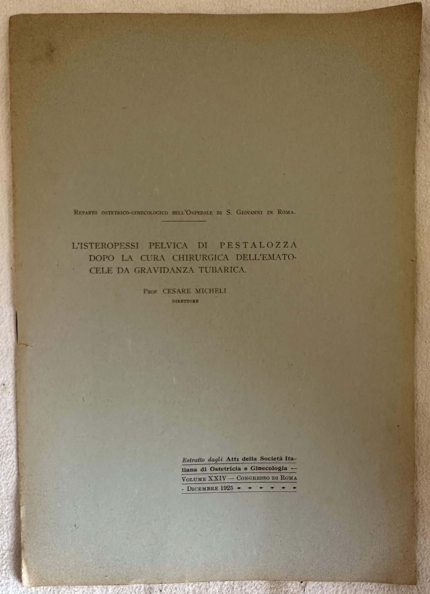 Pubblicazione del 1925 sull'isteropessi pelvica di Pestalozza dopo la cura chirurgica dell'ematocele da gravidanza tubarica di Cesare Micheli. Estratto dagli atti della Società italiana di ostetricia e ginecologia volume XXIV Congresso di Roma. In ottime condizioni. Brossura editoriale in ottime condizioni generali con lievi usure ai margini e dorso. Legatura in ottime condizioni. Pagine in buone condizioni con rare fioriture. In 8. cm 26,5x18,5. Pp. 587-591.Pamphlet of 1925, about isteropessi pelvica of Pestalozza dopo la cura chirurgica dell'ematocele da gravidanza tubarica di Cesare Micheli. Extract from atti della Società italiana di ostetricia e ginecologia volume XXIV Congresso di Roma. In very good conditions. Editorial cover in very good general conditions lightly worn in the extremities. Binding in very good conditions. Pages in good conditions with occasional foxing. In 8. cm 26,5x18,5. Pp. 587-591.