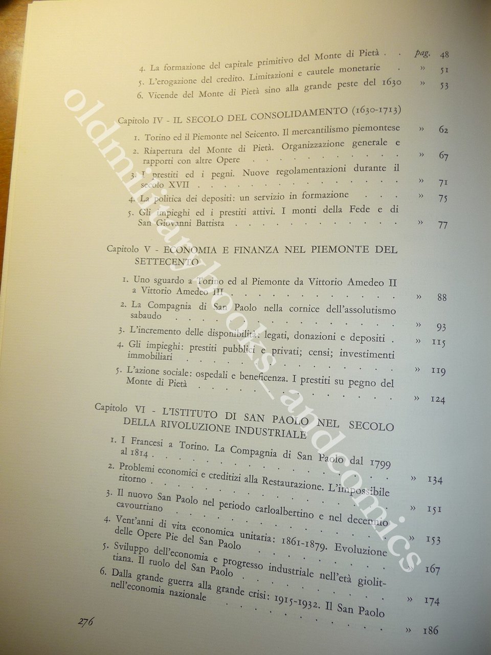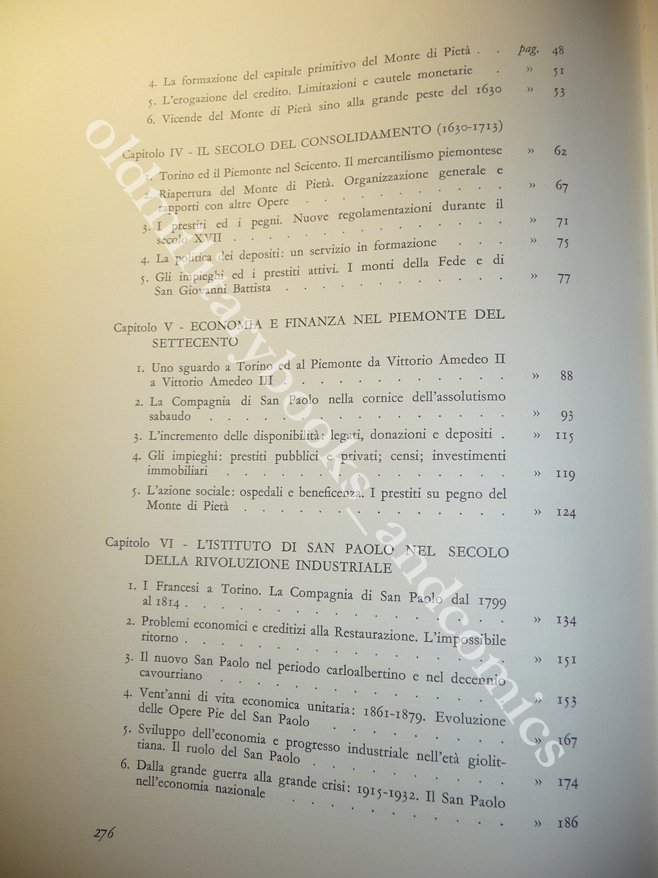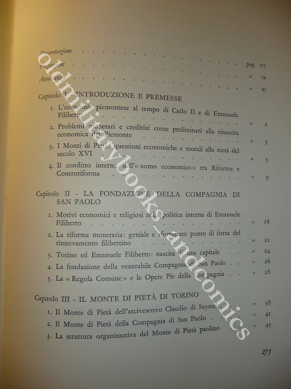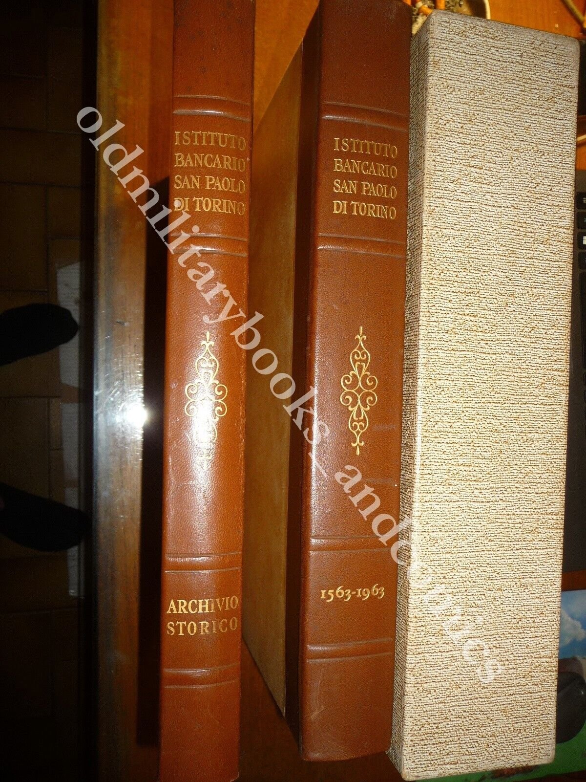 Edizione fuori commercio. In folio, pp. XII, 277; XXXV, 389; leg. edit. m/pelle con tit. e fregi in oro al ds., carta vergata; nel 1 vol. si tratta della storia dell Istituto: La fondazione della Compagnia di S. Paolo, Il Monte di Pietà di Torino, Il secolo del consolidamento, Economia e finanza nel Piemonte del Settecento, L'Ist. S. Paolo nel secolo della rivoluzione industriale, Lo spirito delle origini e le forze evolutive nella storia dell'Istituto, con splendide riproduz. in facsimile di documenti originali, monete su tavv. a colori applicate, carte e vedute ripiegate, stampe e ritratti, capil. e fregi; il 2 vol. è costituito dall'Archivio Storico a cura del Dott. Locorotondo e dell'Ufficio Studi dell'Ist.