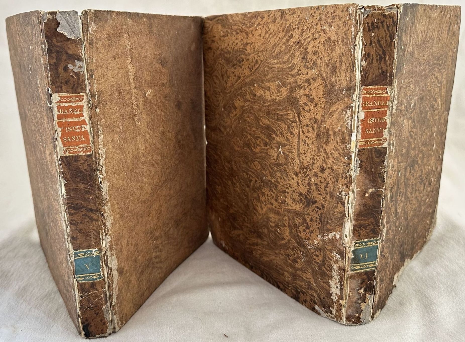 Edizione del 1773 di questa celebre opera del gesuita Giovanni Granelli (1703-1770) erudito e tragediografo. L'opera è un commento organico ai libri dell'Antico Testamento. L'opera era composta da sei tomi siamo in possesso del solo tomo quinto e sesto sui Libri dei Giudici e dei Re. In buone condizioni. Copertina cartonata con titolo in oro al dorso in discrete condizioni generali con lievi usure ai margini e dorso. Legatura in buone condizioni. Pagine in buone condizioni con rare fioriture. Segno di rosicchiatura di topo al margine inferiore delle prime 44 pagine nel tomo sesto. In 8. cm 25x19. pp. VIII+315, 332.<BR>Edition of 1773 of this famous work by the jesuit Giovanni Granelli (1703-1770) scholar and playwriter. The work is an organic comment to the books of Ancient Testament. The work was made up of six tomes, we only have the fifth and sixth tome about the Books of Judges and Kings. In good conditions. Carton cover with gilted title in the spine in fair general conditions lightly worn in the edges and spine. Binding in good conditions. Pages are in good conditions with occasional foxings. Signs of mouse in the foot edge of the first 44 pages in sixth tome. In 8. cm 25x19. pp. VIII+315, 332.<BR><BR> <BR>
