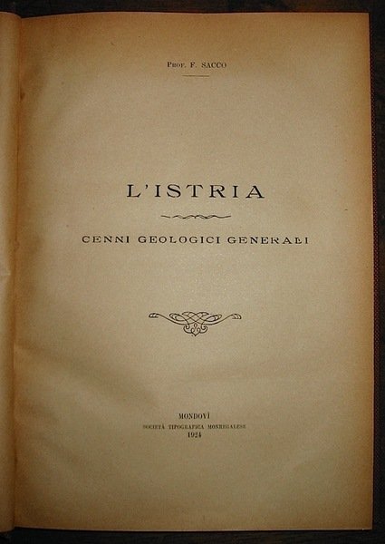 8vo (cm. 25,5), 105(4) pp. (unito) Materiali per la bibliografia geologica, idrologica, speleologica, paleontologica e paleoetnologica dell’Istria e Regioni finitime raccolti da C.F. Parona, F. Sacco e R. Battaglia, Ibidem 1923, CLXXVI pp. Legatura coeva in piena tela con fili e titolo impresso in oro al ds. Volume XIX delle ‘Memorie descrittive della carta geologica d’Italia’. Ottimo esemplare. Raro.