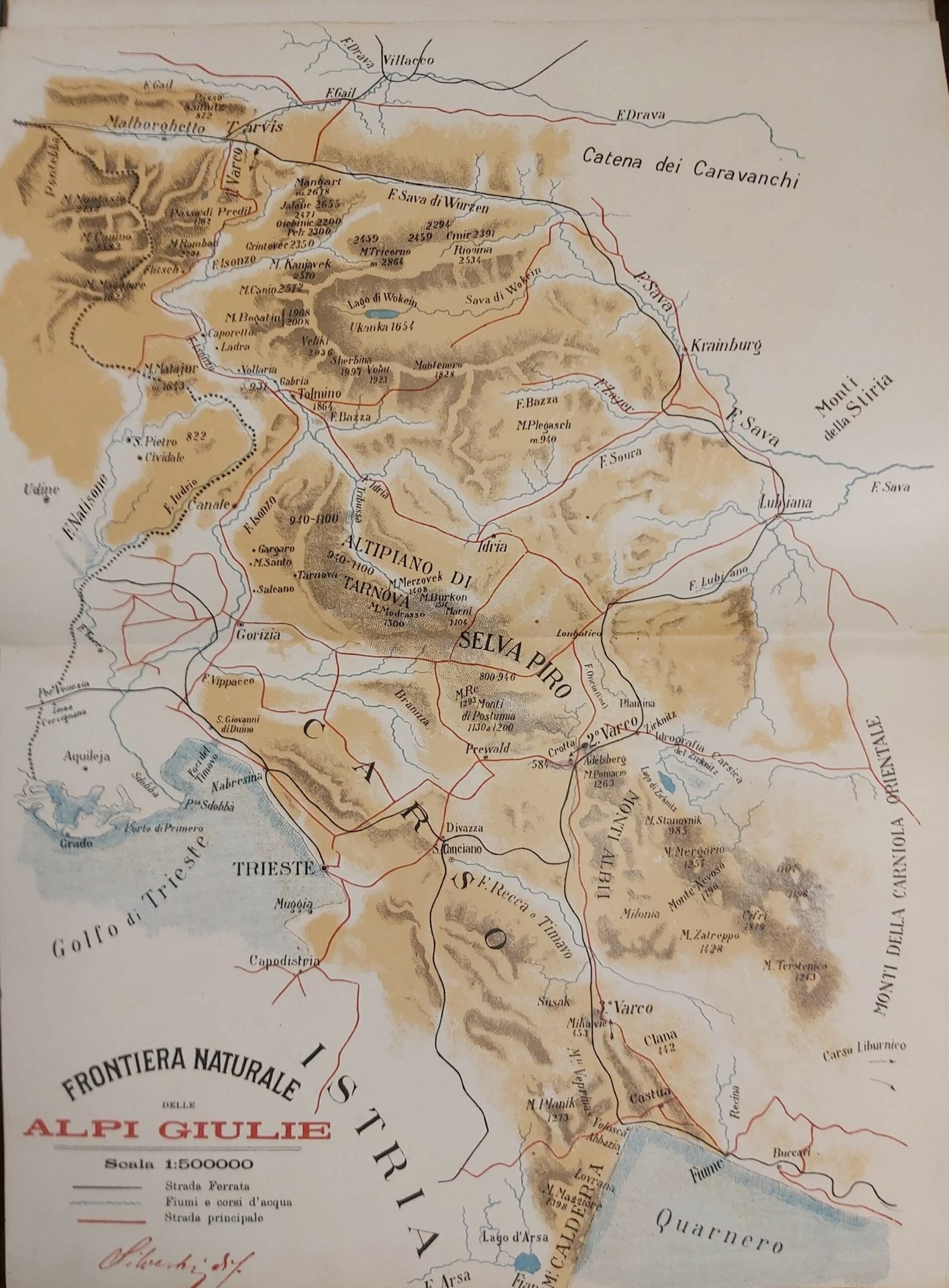gr. vol. in-4, pp. 540, leg. m.t. con tit. al d. e tagli sruzzati. Con molte tavv. anche a colori e una gr. tav. ripiegata raff. le strade e le fortificazioni romane delle Alpi Giulie. Raro studio. [252]