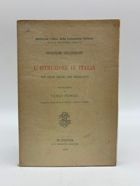 In 16 (cm 13,5 x 20), pp. 95 + (1 bianca). Brossura editoriale. Traduzione italiana curata da Carlo Pascal dall'originale latino "De litterarum studiis apud Italos". "Nessuno ignora l'importanza di questa pubblicazione, che il dotto tedesco stese in latino; diremo qui che, nonostante i lavori posteriori venuti in luce sullo stesso argomento, l'opuscolo del Giesebrecht regge ancora alla critica piu' rigorosa" (La vita italiana. Rivista illustrata, 1897, p. 184).