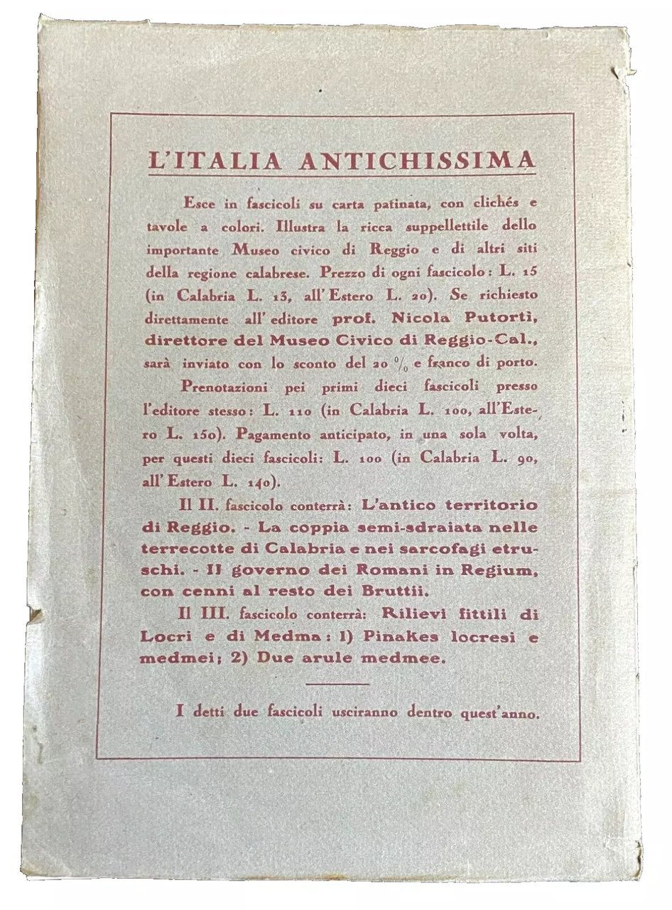 Esce in fascicoli su carta patinata, con clichés e tavole a colori. Illustra la ricca suppellettile dello importante Museo civico di Reggio e di altri siti della regione calabrese. Prezzo di ogni fascicolo: L. 15 (in Calabria L. 15, all'Estero L. 20). Se richiesto direttamente all'editore prof. Nicola Putortì, direttore del Museo Civico di Reggio-Cal., sarà inviato con lo sconto del 20% e franco di porto. Prenotazioni pei primi dieci fascicoli presso l'editore stesso: L. 110 (in Calabria L. 100, all'Estero L. 150). Pagamento anticipato, in una sola volta, per questi dieci fascicoli: L. 100 (in Calabria L. 90, all' Estero L. 140). II II. fascicolo conterrà: L'antico territorio di Reggio. La coppia semi-sdraiata nelle terrecotte di Calabria e nei sarcofagi etruschi. Il governo dei Romani in Regium, con cenni al resto dei Bruttii. II III. fascicolo conterrà: Rilievi fittili di Locri e di Medma: 1) Pinakes locresi medmei; 2) Due arule medmee.