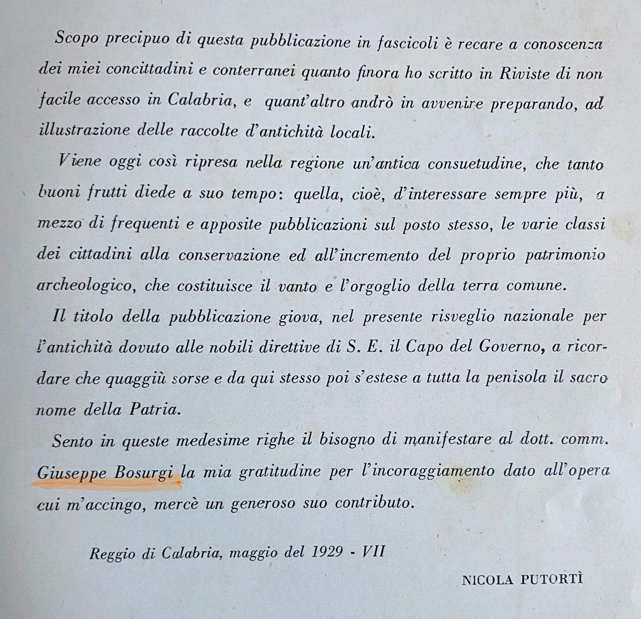 Scopo precipuo di questa pubblicazione in fascicoli è recare a conoscenza dei miei concittadini e conterranei quanto finora ho scritto in Riviste di non facile accesso in Calabria, e quant'altro andrò in avvenire preparando, ad illustrazione delle raccolte d'antichità locali. Viene oggi così ripresa nella regione un'antica consuetudine, che tanto buoni frutti diede a suo tempo: quella, cioè, d'interessare sempre più, a mezzo di frequenti e apposite pubblicazioni sul posto stesso, le varie classi dei cittadini alla conservazione ed all'incremento del proprio patrimonio archeologico, che costituisce il vanto e l'orgoglio della terra comune. Il titolo della pubblicazione giova, nel presente risveglio nazionale per l'antichità dovuto alle nobili direttive di S. E. il Capo del Governo, a ricordare che quaggiù sorse e da qui stesso poi s'estese a tutta la penisola il sacro nome della Patria. Sento in queste medesime righe il bisogno di manifestare al dott. comm. Giuseppe Bosurgi la mia gratitudine per l'incoraggiamento dato all'opera cui m'accingo, mercé un generoso suo contributo. Reggio di Calabria, maggio del 1929 VII.