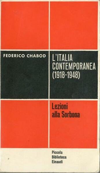 2. ed. 216 p. ; 18 x 11 m. Piccola biblioteca Einaudi, 11. "L'Italia contemporanea" è un'opera storiografica dello storico Federico Chabod edito per la prima volta in lingua francese intitolato "L'Italie contemporaine" e pubblicato a Parigi nel 1950. La storia della genesi e dello sviluppo del regime fascista viene ricostruita in queste lezioni che Chabod tenne alla Sorbona con indubbia imparzialità benché l'autore non nasconda mai le sue convinzioni antifasciste. Brossura editoriale, coperta in cartoncino flessibile colorato (b/n, rosso), titolo al piatto e al dorso. Segni del tempo (leggero ingiallimento e fioritura) ai tagli, qualche sottolineatura a matita in alcune pagine, per il resto libro integro, da studio. Codice libreria 7886.