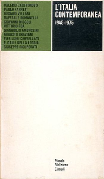XII, 468 p. ; 18 x 11 cm. Piccola biblioteca Einaudi. Geografia. Storia. Questo volume con contributi di vari autori (V. Castronovo, P. Farneti, R. Villari, R. Romanelli, G. Miccoli, V. Foa, G. Ambrosini, A. Graziani, P.L. Cervellati, E. Galli della Loggia e G. Ricuperati) tenta un'interpretazione dei primi trent'anni della storia della Repubblica, per coglierne i tratti essenziali, le contraddizioni e le tendenze di fondo. Brossura editoriale, coperta in cartoncino flessibile colorato (b/n e verde). Qualche segno del tempo alla coperta e ai suoi profili per il resto buon esemplare. Codice libreria 2784.