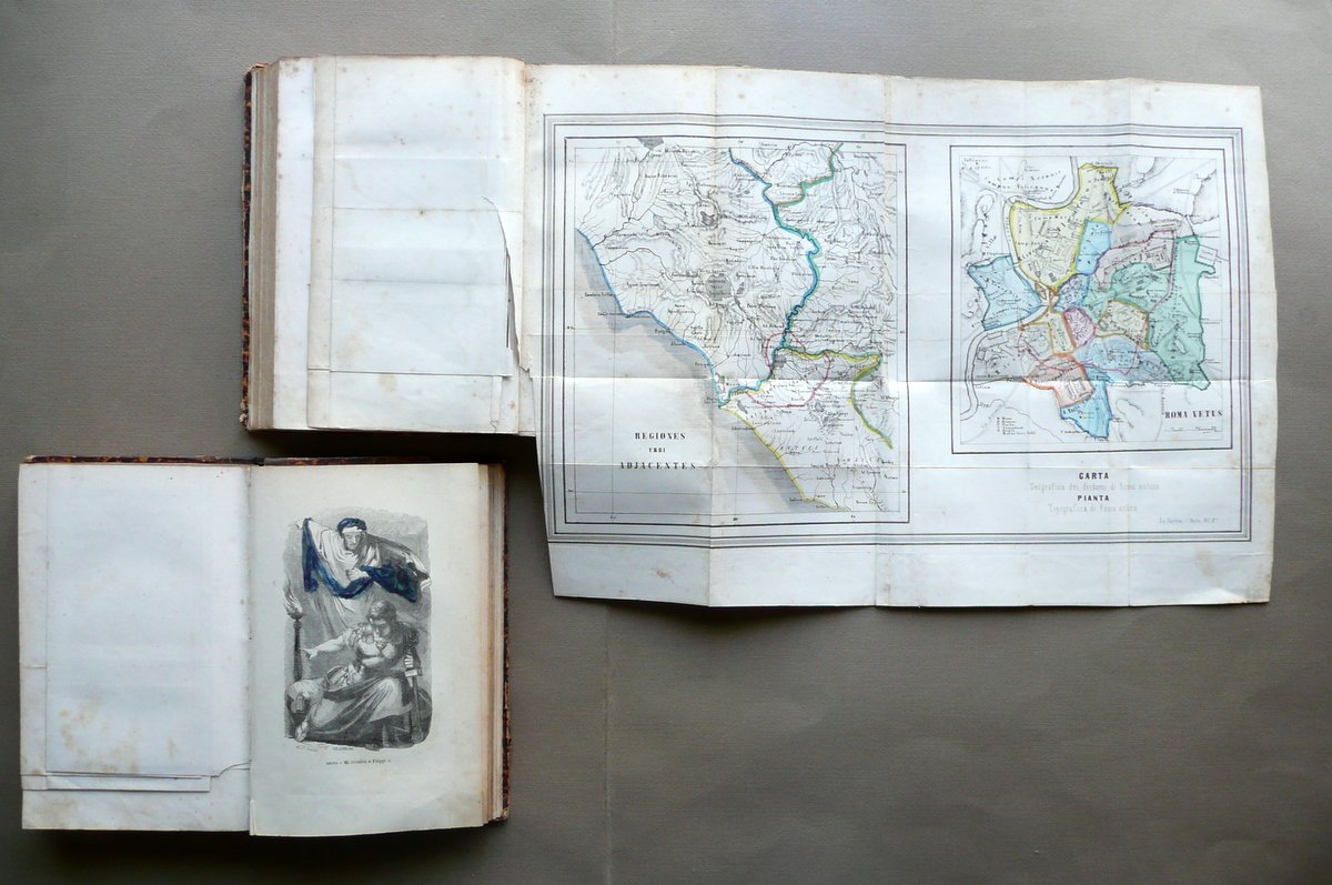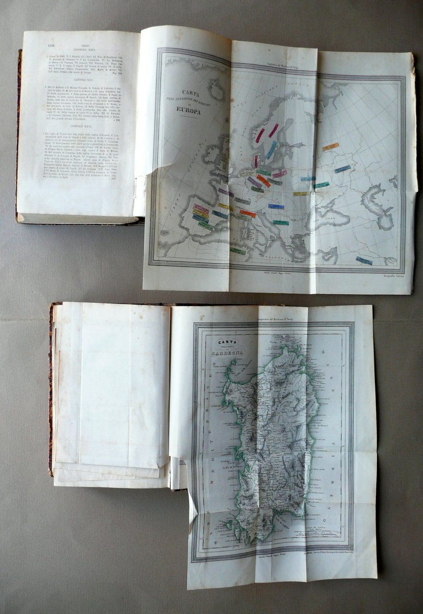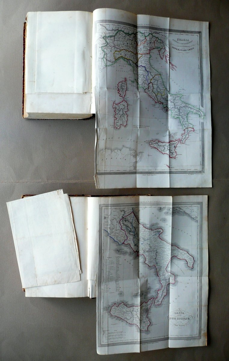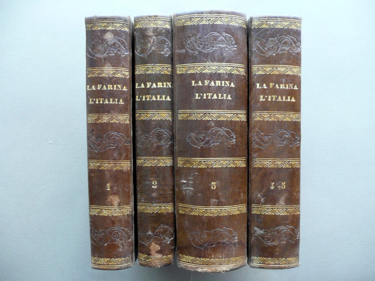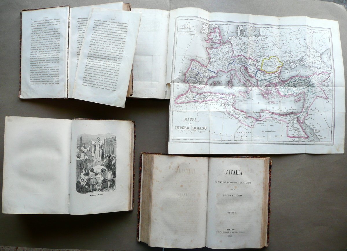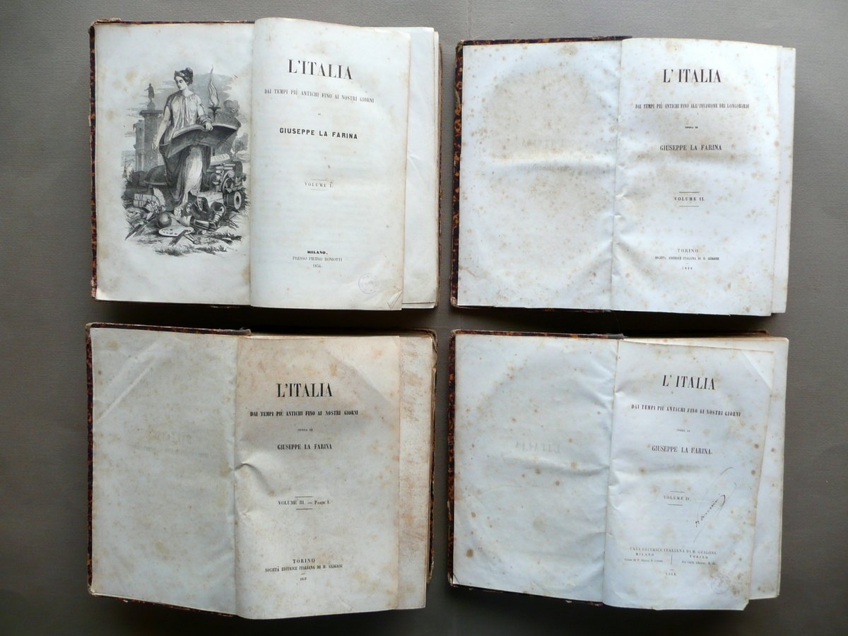 Giuseppe La Farina, † L'Italia dai tempi pi˘ antichi fino ai nostri giorni di Giuseppe La Farina Volume I - II - III - IV - V (cinque volumi rilegati in quattro tomi) Presso Pietro Boniotti (voll. I-IV) - Societ‡ Editrice di Maurizio Guidoni (vol. V), Milano 1856-63; cm 23,5x15; pp. 520 (volume I); pp. 472 (volume II); pp. 1136 (volume III); pp. , con 14 carte geografiche rip. pi˘ volte e con pi˘ di 150 tavole incise in b/n fuori t.; legatura d'epoca in mezza pelle con titolo e fregi impressi in oro al dorso, piatti in carta marmorizzata. Frontespizi con firma di propriet‡ e timbretto - ex libris del precedente proprietario. Opera in cinque volumi rilegati entro quattro tomi. † Condizioni di conservazioni Esemplare ben conservato con tracce d'uso; coperte con alcune leggere abrasioni, piccole mancanze ai margini e angoli dei piatti.†Interni buoni con alcune leggere bruniture; poche pagine con qualche segnetto a matita o a pastello colorato. Qualche tavola fuori t. parzialmente colorata a mano (colorazione d'epoca). Pagina 7 del volume I staccata dal corpo del testo,†angolo inf. delle pp. 401-402 del volume IV con una piccola mancanza che non interessa il testo. Carte rip. pi˘ volte con pochi piccoli strappetti / pieghette ai margini ed angoli; una carta del volume V staccata dal corpo del testo (vedi foto). † Opera in cinque volumi rilegati entro quattro tomi, corredata da 14 carte geografiche ripiegate pi˘ volte e da pi˘ di 150 tavole incise in bianco e nero di vedute, ritratti di personaggi celebri, costumi, monumenti, ecc. † SETT45.L13102 N