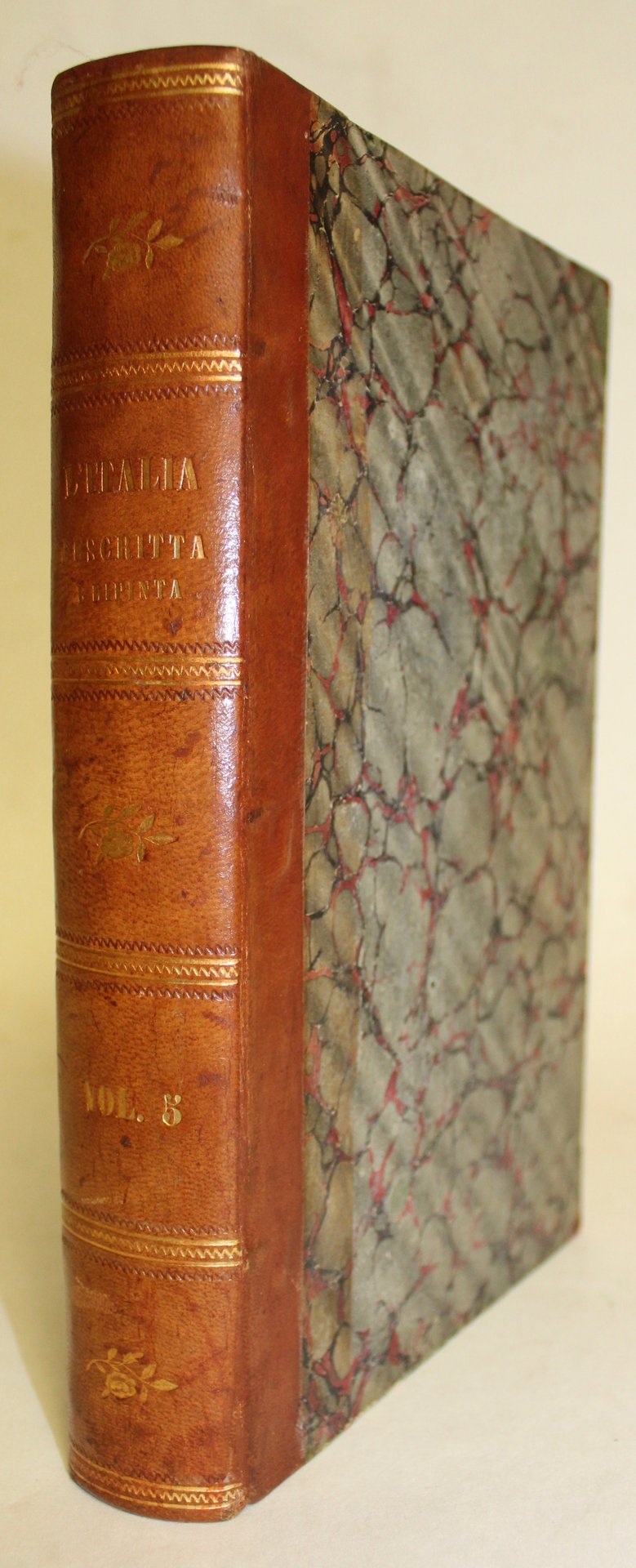 Due tomi in uno. In 8°(mm 265x165); pagg. 108 con 26 tavv. f.t.; pagg. 376, (2) con 68 tavole fuori testo incise in acciaio, nel secondo tomo, alcune con due incisioni per foglio, raffiguranti vedute di Toscana, Regno di Napoli, Mezza pelle nocciola con titolo in oro al dorso e fregi dorati. Descrive storia, monumenti, gastronomia, economia delle suddette regioni.<BR>Bell'esemplare che presenta usuali lievi fioriture della carta e arrossamenti. La versione originale francese di Parigi fu compilata da L. E. Audot 1834. <BR>Biblioteca italiana… 1837, p. 67. "Prima traduzione italiana, con aggiunte e correzioni… Quest'opera meglio che versione, e compilazione anonima di Davide Bertolotti (1784 - 1860).