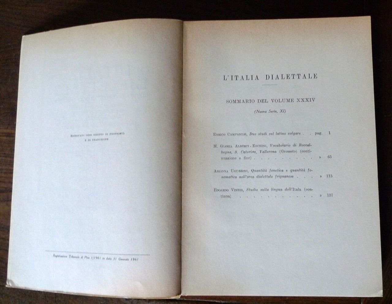 L'ITALIA DIALETTALE.RIVISTA DI DIALETTOLOGIA ITALIANA vol.XXXIV 1971 Pisa