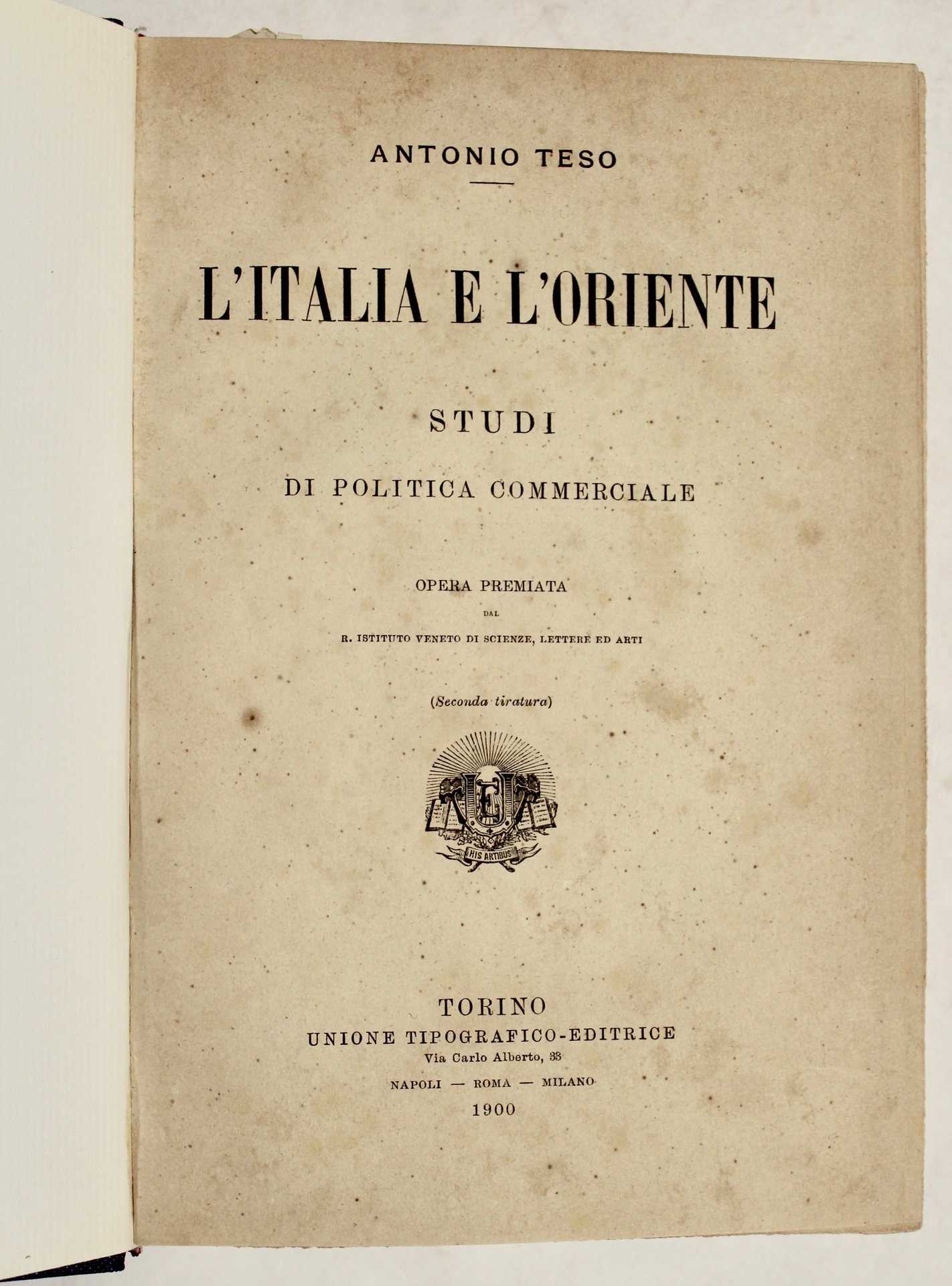 In 8°; pagg. 510. Mezza tela editoriale con angoli, titolo su tassello al dorso e filetti dorati. Lievissime sporadiche fioriture. Buon esemplare in barbe. <BR>Tratta delle vie commerciali tra l'Europa e l'Oriente; degli effetti economici del Canale di Suez e dei perfezionamenti tecnici della navigazione e del commercio attraverso il canale; riguarda inoltre le colonie africane, la Cina, il Giappone, l'Australia e loro economia, analizza l'importanza dei trasporti ferroviari, dei trafori alpini ed altri argomenti vari.