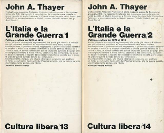 2 v. (706 p. compl.) ; 18 cm. Cultura libera, 13/14. Frutto di quella storiografia anglosassone alla quale già tanto si è debitori per gli importanti contributi all'approfondimento della storia italiana contemporanea, la presente opera rappresenta un originale tentativo di chiarirne i motivi e le vicende dominanti la scena politica italiana tra il 1870 e il 1915, in stretta connessione con la situazione culturale di quegli anni. Il background remoto e meno remoto, secondo la testi dell'autore, sul quale si devono ricercare le ragioni del successivo fenomeno fascista, per il quale la Grande guerra avrebbe servito da «detonatore». Essenzialmente, dunque, uno studio ideologico, un'analisi dei problemi di fondo accumulatisi negli anni post Risorgimento, che la guerra avrebbe drammaticamente portato alla ribalta. Titolo originale dell'opera: «Italy and the Graeat War, politics and culture, 1870-1915». Traduzione italiana di Maria Pia Lunati Figurelli. Legatura editoriale, coperta in cartone rigido telato di colore rosso, titolo impresso in bianco al dorso, muto il piatto. Sovraccoperta in carta plastificata lucida. Codice libreria 6461.