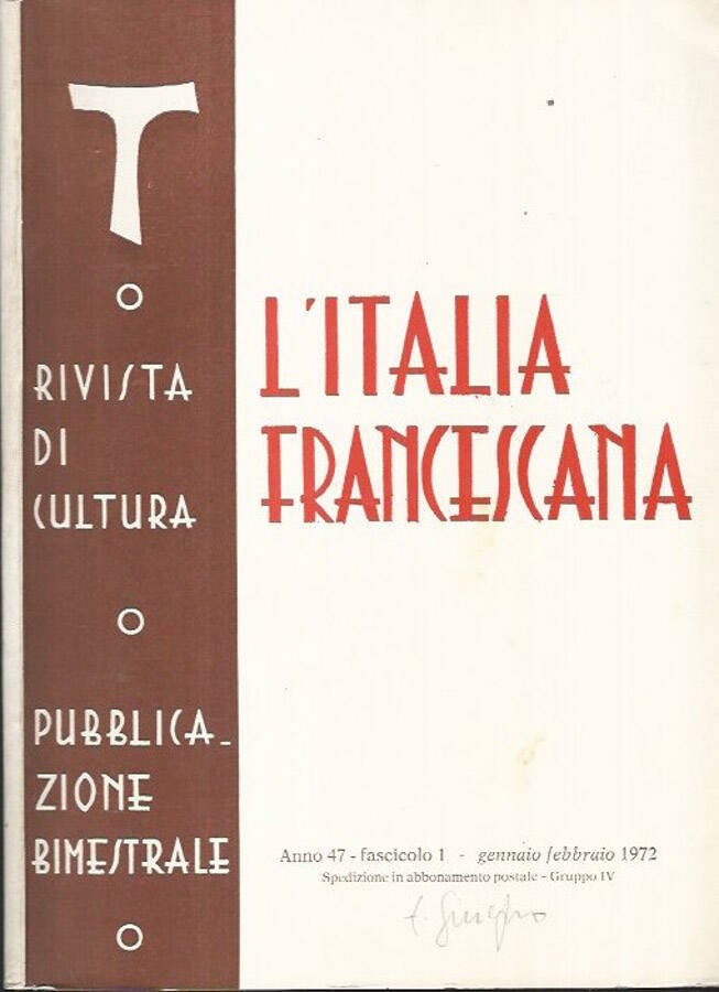 L'Italia Francescana, rivista di cultura, pubblicazione bimestrale, anno 47, gennaio-febbraio 1972, il volume è ben conservato, la copertina chiara, lievi note a matita, le pagine all'interno ben mantenute. numero pagine 68