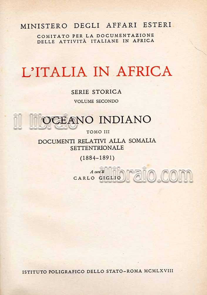in 8°; pp. 244; leg.; coll. Serie storica, # 2 Oceano indiano (tomo III), documenti relativi alla Somalia settentrionale (1884-1891). Pubblicazione curata dal Min. degli Affari Esteri Comitato per la documentazione delle attività Italiane in Africa