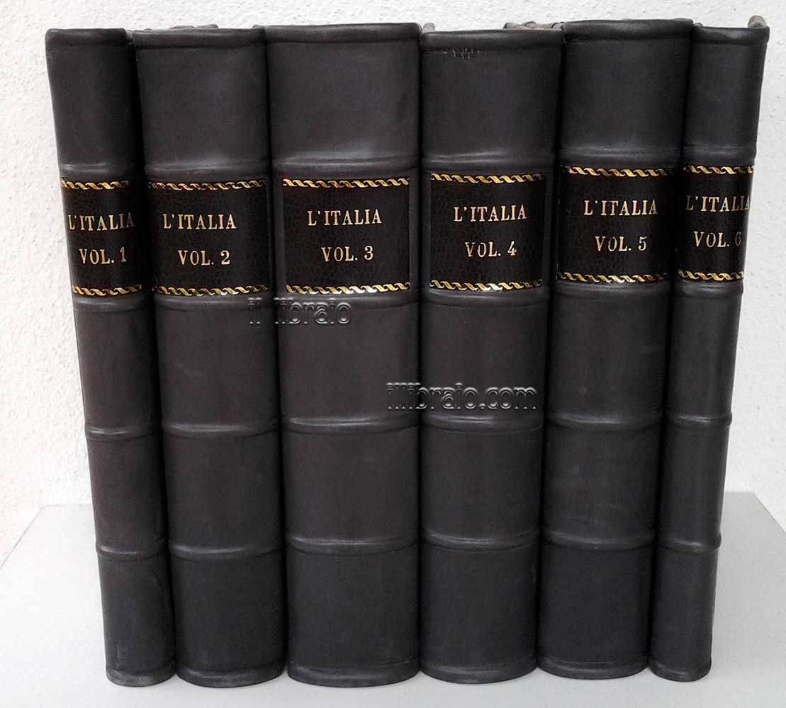 5 tomi in 6 voll.; in 8°; pp. pp. 4, VIII, 108; 4, 268; 269-376; VI, 368; (4), 320; (4), 328 (ill. in bn.); leg. in mezza pelle con nerzi e tasselli con titolo in oro al dorso; piatti marmorizzati; 1^ ed. italiana. Volume completo delle splendide 328 tavv. incise su acciaio f.t. (molte contenenti anche più di una illustrazione) di località, città, paesi, monumenti, scene e costumi eseguite da vari artisti (Haudebourt-Lescot, Horace Vernet, Granet, Isabey, Ciceri, Mazzara, Light, Batty, Cooke, Gell, Gandy, Pinelli, Ferrari, ecc.). Testo su due colonne. Tavola alfabetica generale in fine del V tomo. Questa monumentale opera, con aggiunte e correzioni rispetto a quella originale francese, ricca di preziose informazioni storiche e topografiche e ispirata alle impressioni e alle ricerche di alcuni dei massimi scrittori del XIX secolo, amanti e visitatori dell'Italia: Goethe, Chateaubriand, Lamartine, Vivant Denon, Richard de Saint Non, Byron, Swinburne, ecc. Tomo I: Gran Ducato di Toscana - Tomo II: Regno di Napoli, Sicilia e Malta - Tomo III: Roma - Tomo IV: Regno Lombardo Veneto, Canton Ticino, ducati di Parma, Modena e Lucca e Corsica - Tomo V: Regno di Sardegna. (cfr. Cremonini, nn. 121-122. Menichelli, n. 846. Fossati-Bellani, I, nn. 522-525. Olschki, "Choix", 1108: "Ouvrage monumental qui conservera toujours une grande valeur"). (fioriture diffuse - buon esemplare)