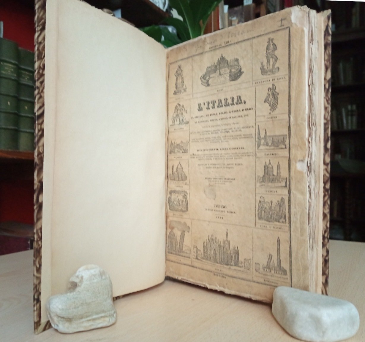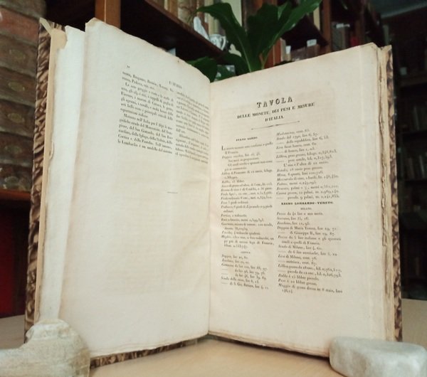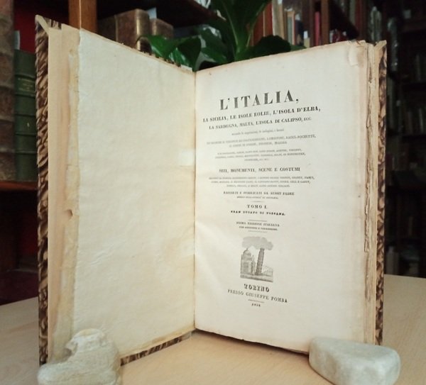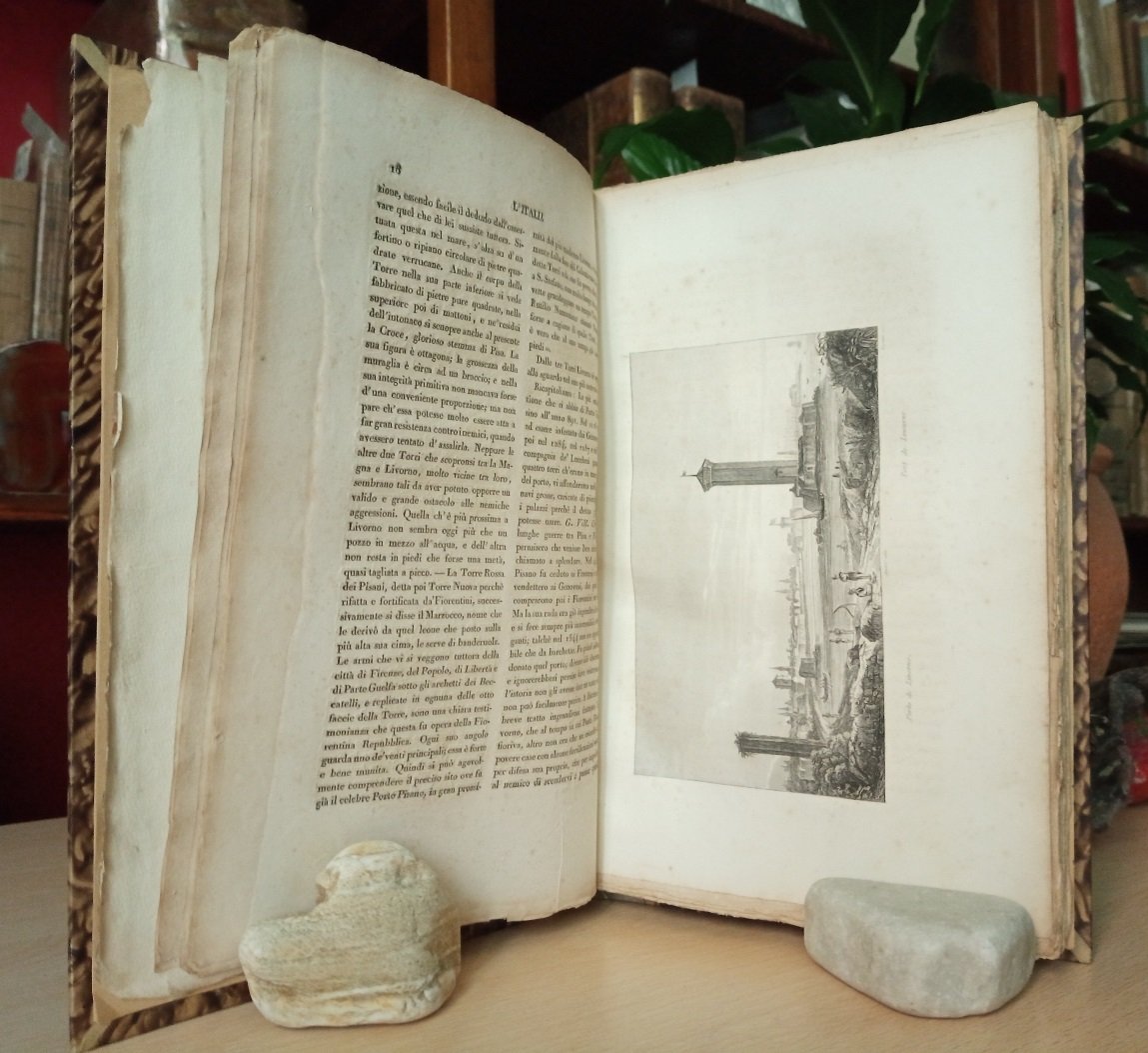 Volume in 4 legato in mezza pergamena, titolo al tassello al dorso (applicata etichetta di biblioteca privata), conservata la brossura editoriale con titolo al piatto incorniciato da quattordici vignette xilografiche con altrettante vedute italiane, frontespizio, sommario delle materie e delle incisioni, introduzione, tavola delle Monete, Misure e Pesi dItalia, 4, VIII, 108 pp., completo delle 26 tavole f.t., con 28 incisioni complessive. Prima edizione italiana, con aggiunte e correzioni rispetto all'originale francese, del tomo primo, riguardante il Gran Ducato di Toscana (Isola dElba, Livorno, Pisa Firenze, Poggio Imperiale, a Caiano, Pratolino, Fiesole, Siena, Montalcino, Arezzo, Cortona, Chiusi, Prato, Pistoia, Maremma, Volterra, Massa, Piombino) in s perfettamente compiuto, di questa importante e bellissima opera sullItalia ricca di preziose informazioni storiche e topografiche, ispirata alle impressioni e alle ricerche di alcuni dei massimi scrittori del XIX secolo, amanti e visitatori dell'Italia e raffigurata da famosi artisti, con raffinate graziose vedute, costumi e scene popolari incise in acciaio su tavole f.t. da Audot padre. Esemplare completo, freschissimo, molto ben conservato, in barbe, con davvero rare fioriture.