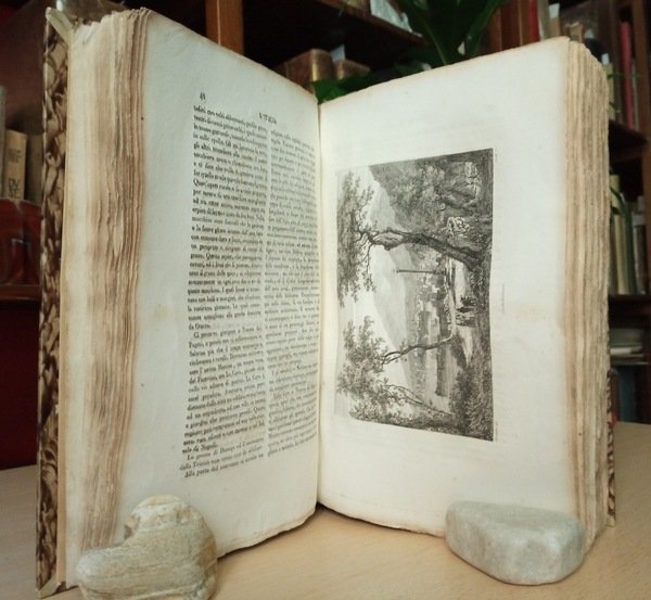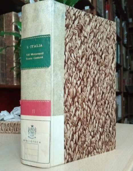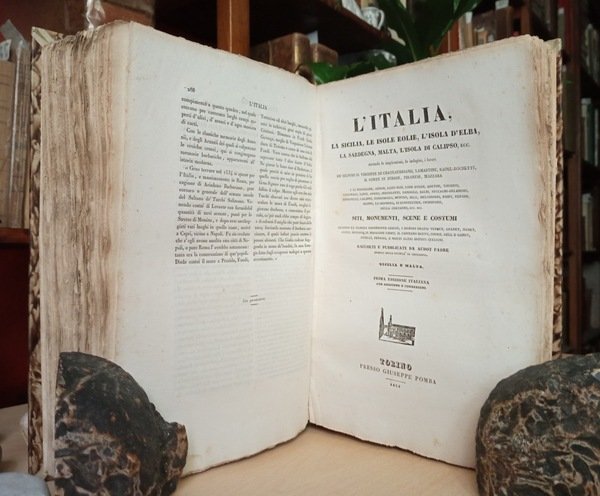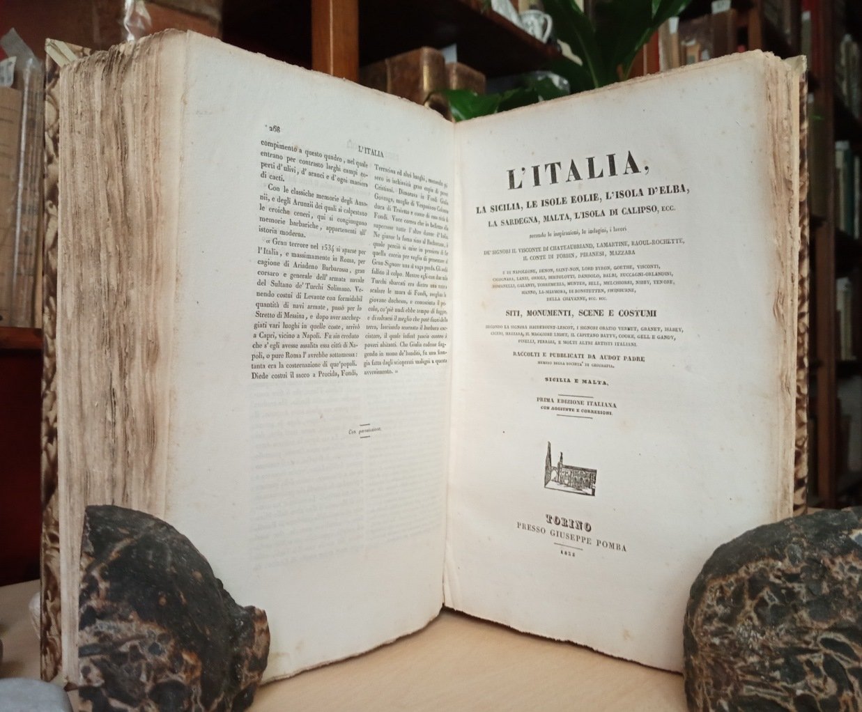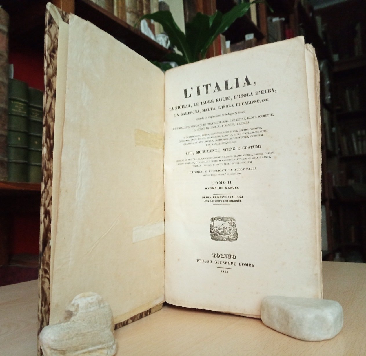 Volume in 4 legato in mezza pergamena, titolo al tassello al dorso (applicata etichetta di biblioteca privata), conservata la brossura editoriale con titolo al piatto incorniciato da quattordici vignette xilografiche con altrettante vedute italiane, frontespizi (uno per il Regno di Napoli e uno per Sicilia e Malta), sommario delle materie e delle incisioni, ; 4, 376 pp. e 99 tavole. Prima edizione italiana, con aggiunte e correzioni rispetto all'originale francese, del tomo secondo, riguardante il Regno di Napoli (Lazio pontino e ciociaro, Campania, Abruzzo e Molise, Puglia, Calabria) nella sua prima parte (fino a pag. 268) e riguardante Sicilia e Malta, con proprio frontespizio ma con numerazione continua, in s perfettamente compiuto, di questa importante e bellissima opera sullItalia ricca di preziose informazioni storiche e topografiche, ispirata alle impressioni e alle ricerche di alcuni dei massimi scrittori del XIX secolo, amanti e visitatori dell'Italia e raffigurata da famosi artisti, con raffinate graziose vedute, costumi e scene popolari incise in acciaio su tavole f.t. da Audot padre. Esemplare completo, freschissimo, molto ben conservato, in barbe, con davvero rare fioriture.