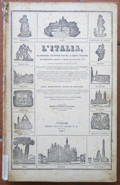 Torino, Giuseppe Pomba, 1834. Prima edizione italiana con aggiunte e correzioni. In 8vo lungo, pp. 108, completo delle 26 incisioni in acciaio in b/n f. t. che raffigurano “siti, monumenti, scene e costumi”, in questo caso relativi al solo Gran Ducato di Toscana, leg. orig. in cartonato con vignette relative ad alcune città italiane. Foxing diffuso, talora anche ad alcune delle tavole, altre sono invece pulite e in ottima impressione. .