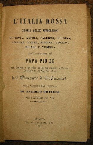L’Italia rossa. Storia delle rivoluzioni di Roma, Napoli, Palermo, Messina, Firenze, Parma, Modena, Torino, Milano e Venezia dall’esaltazione del Papa Pio IX nel giugno 1846 sino al di lui ritorno nella sua Capitale in aprile del 1850. Prima versione dal francese di Angiolo Orvieto