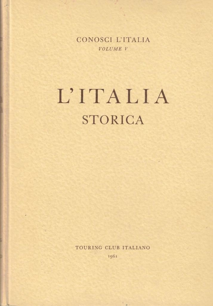 L’Italia storica, Touring Club Italiano, Milano 1961, pp. 288, ill. b.n. e col., 48 c. di tavv. f.t. ill. b.n. e col., 1 c. di tav. f.t. ripiegata ill. col. con carta geografica, cm 28, cart. ed. con titoli al dorso e al piatto. Collana Conosci l’Italia, vol. V. Minime sgualciture alla tavola ripiegata, per il resto ottimo.
