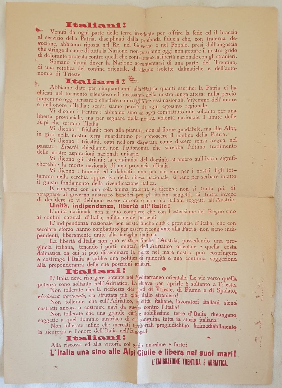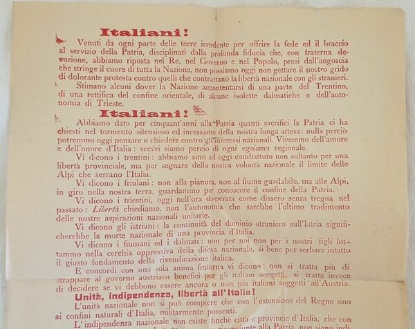 Rarissimo volantino di esortazione alla lotta per la liberazione dalla dominazione austriaca a firma "L'emigrazioene trentina e adriatica". Il volantino si rivolge al Trentino, Friuli, Istria, Fiume e Dalmazia. In buone condizioni, piegature. Piccolo strappo. In folio. cm 38x27,5. Very scarce pamphlet of esortation of fight for independence from Austrian domination signed "L'emigrazioene trentina e adriatica". The pamphlet is addressed to Trentino, Friuli, Istria, Fiume e Dalmazia. In good conditions, foldings. Little tear. In folio. cm 38x27,5.