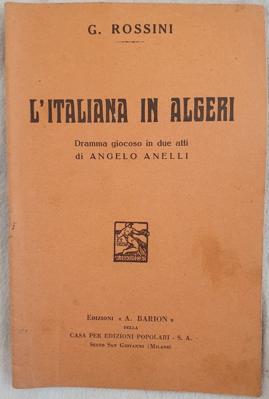 Bel libretto d'opera del 1934 dell'opera "L'italiana in Algeri" di Gioachino Rossini (1792-1868) su libretto di Angelo Anelli. La prima rappresentazione ebbe luogo il 22 maggio 1813 al Teatro San Benedetto di Venezia. In buone condizioni. Brossura editoriale in buone condizioni generali con lievi usure ai margini e dorso. Macchie (vedere foto). Legatura in buone condizioni. All'interno le pagine si presentano in buone condizioni con fioriture. In 16. Dim. 18,5x12 cm. Pp. 32.