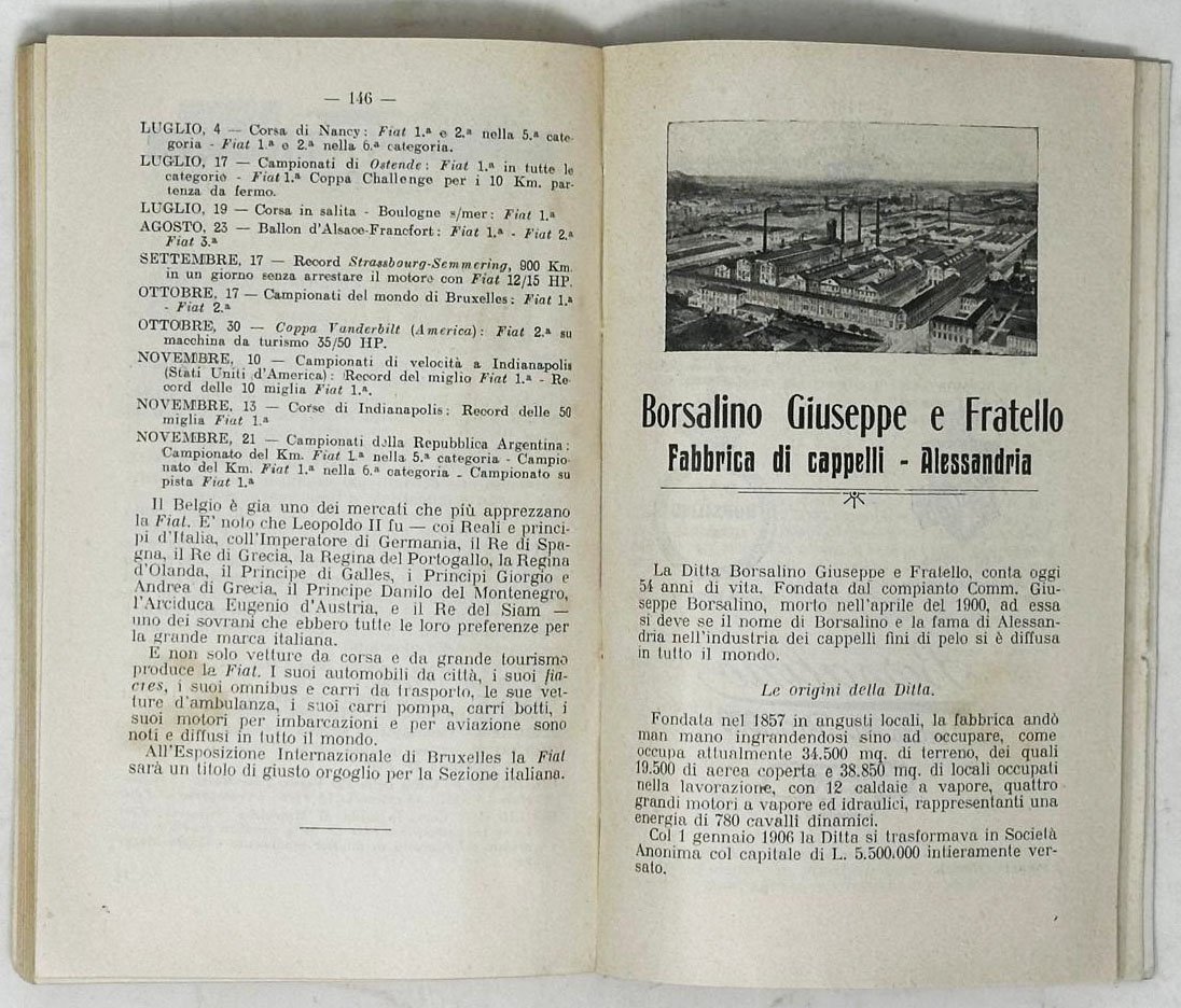 Rara guida originale, in lingua italiana, di Bruxelles e dell'esposizione Universale del 1910. L'attualità, Milano. Pagine: 157 + [3]. Formato: 10,5 x 17 cm circa. Guida corredata da due grandi carte geografiche (più volte ripiegate su se stesse a causa delle dimensioni): la prima di Bruxelles, la seconda (a colori) dell'esposizione universale internazionale Bruxelles 1910. Interessante anche l'ultima sezione della guida, dedicata alle grandi industrie italiane (in cui sono trattate la Pirelli, con foto dei vari stabilimentidi Milano, de la Spezia, in Spagna, La Società Anonima 'Officine Meccaniche', la FIAT; Borsalino Giuseppe E Fratello Fabbrica Di Cappelli di Alessandria, La Rusconi Fraschini & c. di Milano, 'La filotecnica' di Milano, 'Birra Milano', .). Stato di conservazione: qualche leggera scoloritura sulla copertina, ordinari segni del tempo e dell'utilizzo ma, nel complesso, un buon esemplare. privo di timbri, firme di appartenenza o altri segni nel testo. Copertina cartonata semi rigida in tutta tela. Numerose illustrazioni fotografiche in nero nel testo. Molto bella la pubblicità della 'G.B. BORSALINO' su doppia pagina al fondo del volume.