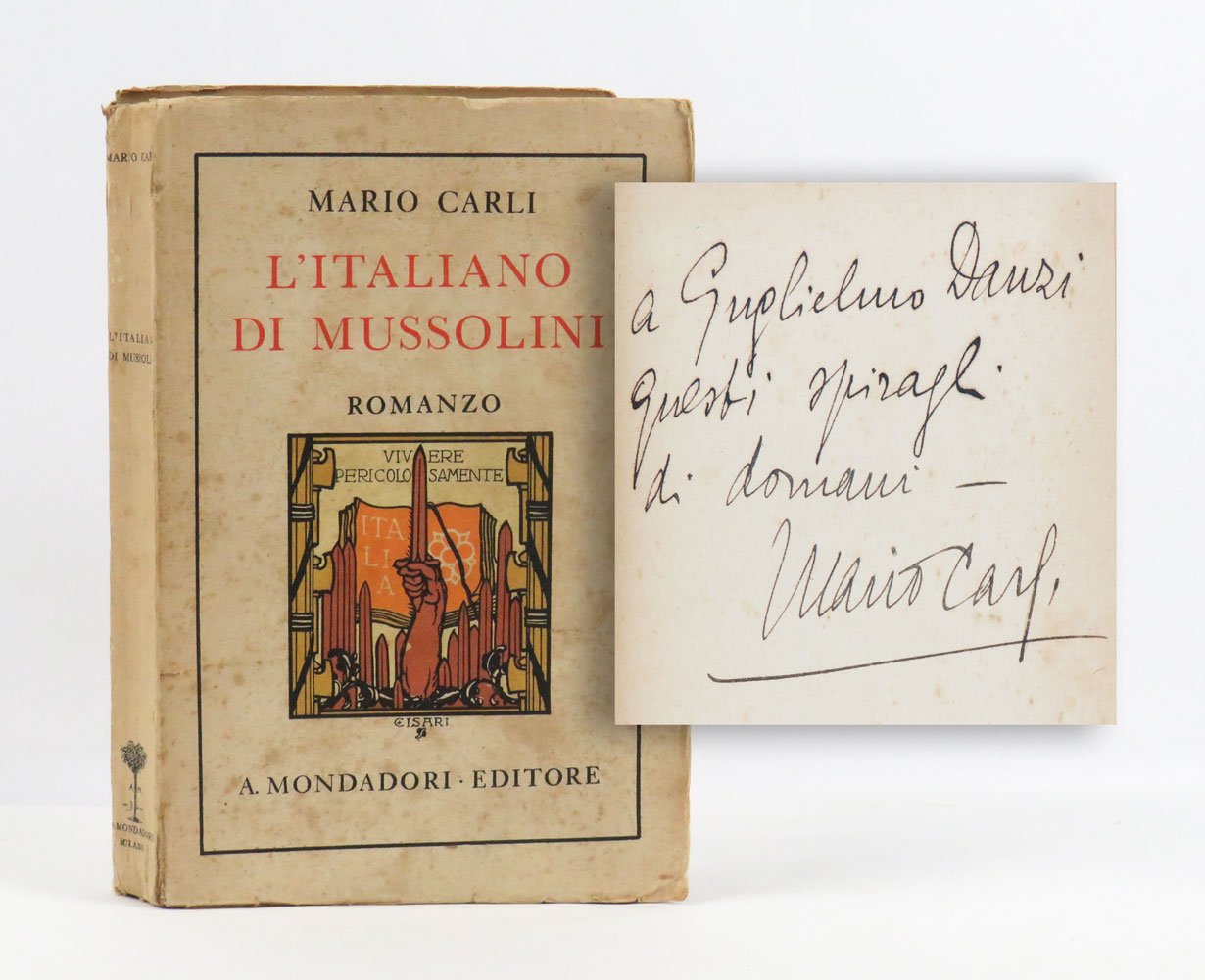 LIBROEdizione originale.CON AUTOGRAFO.Brossura fiorita, dorso appena inclinato: nel complesso un più che buon esemplare pregiato dalla dedica autografa dell’autore al giornalista Guglielmo Danzi, che diresse l’ultima fase di vita della rivista «Circoli»: «A Guglielmo Danzi questi spiragli di domani — Mario Carli».Culmine e sintesi delle due anime di Mario Carli, il brillante romanziere — da «Retroscena» a «Trillirì» — e l’ardito propagandista del fascismo, «L’italiano di Mussolini» inscena il contrasto ideale e irreale tra un’Italia “giolittiana” e la nuova Italia fascista in un romanzo blandamente fantascientifico (cfr. D. Cammarota, «Fantascienza», voce del Diz. Fut., p. 431a), ambientato in un generico futuro utopistico, specchio di un vagheggiato presente. Il romanzo ebbe un notevole successo, venendo tradotto in tedesco («Der Fascist», 1931), in francese («L’Italien de Mussolini», 1932) e in portoghese («O Homem de Mussolini», 1932-1933) e meritandosi una seconda edizione nei «Libri azzurri» Mondadori, uscita postuma con data 1937 e una lunga prefazione di Marinetti che ripercorreva la vita e le gesta dell’amico appena scomparso (Carli morì anzitempo nel settembre del 1935).Bibl. Cammarota, Futurismo, n. 85.19.