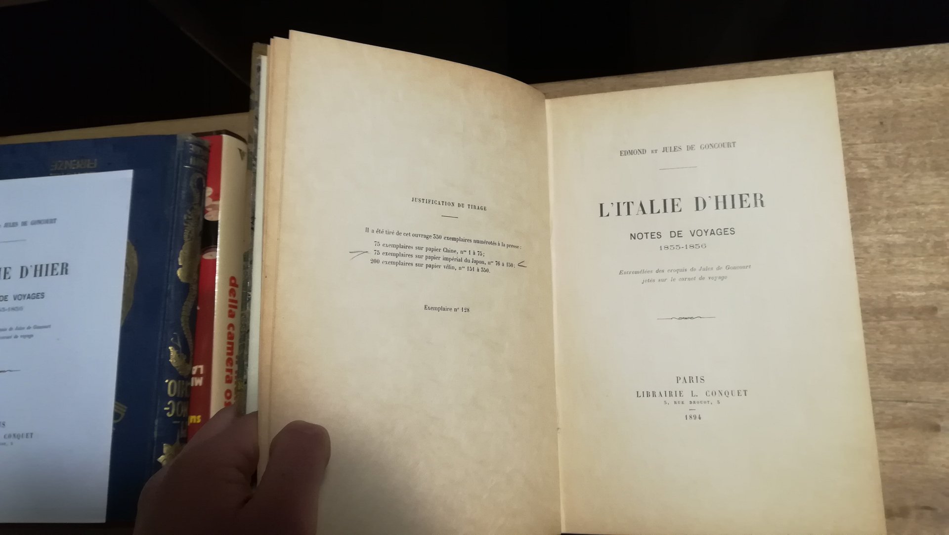 De Goncourt - L'Italie d'hier. Notes de voyages 1855-1856 Librairie L. Conquet - 1894 Libro in ottime condizioni, minimi segni del tempo. Edizione in 350 esemplari, questa limitata a 75 esemplari in papier imp?©rial du Japon (76-150, questa il numero 128). Il testo presenta 48 illustrazioni in bianco nero e cinque a colori, di cui tre a doppia pagina. Rilegatura in mezza tela broccata in ottimo stato di conservazione, minime abrasioni al dorso. Non esitate a contattarci per altre foto o richieste. Saremo lieti di soddisfare ogni vostra esigenza.