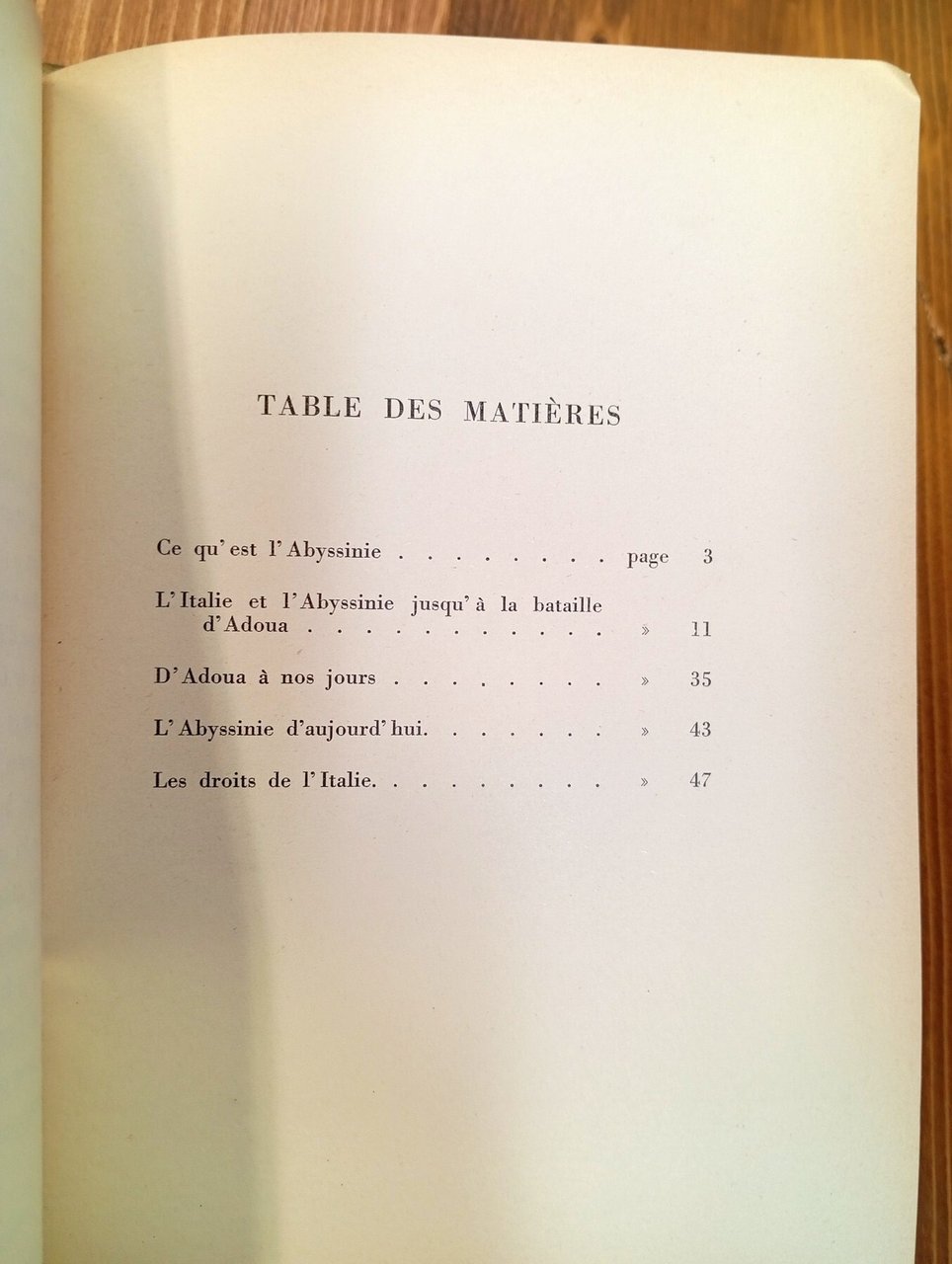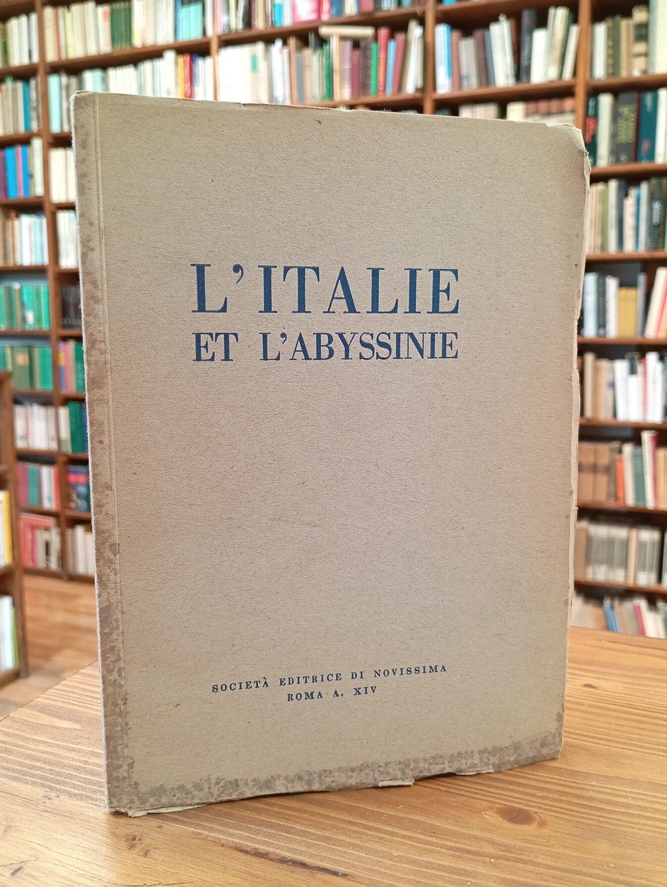 Brossura editoriale di 53 pagine con una cartina all'antiporta e 8 fotografie in bianco e nero fuori testo. Testo in lingua francese; indice consultabile nelle nostre immagini. Tracce di ossidazione ai margini di copertina e al taglio inferiore, peraltro esemplare integro e ben conservato, interno fresco e godibile; edizione non comune -- Resoconto storico e geopolitico sull'Abissinia e sui "diritti" avanzati dall'Italia fascista nei confronti delle sue colonie.