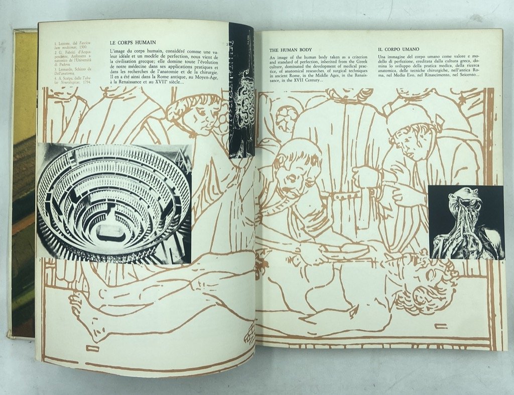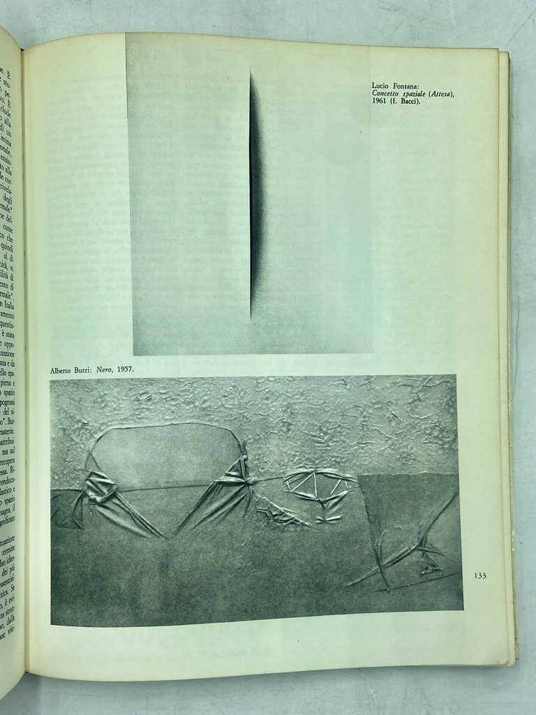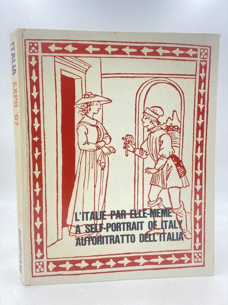 Cartonato editoriale illustrato, cm 26.5 x 21, pp 229 (11) illustrate in nero e arancio. Testo in francese, inglese e italiano. Volume pubblicato dal Commissariato Generale Italiano per l’Esposizione Universale di Montreal del 1967, con progetto grafico di Bruno Munari, testi di Umberto Eco (La vita italiana; La musica contemporanea e i movimenti d’avanguardia), Bruno Zevi (L’architettura italiana e l’Esposizione di Montreal), Giulio Carlo Argan (L’arte contemporanea), Guido Piovene (La letteratura), Luigi Chiarini (Il Cinema), Vittorio Gregotti (Il design), Vincenzo Caglioti (La ricerca scientifica), Gino Bozza (La ricerca tecnologica), Francesco Masera (Lo sviluppo dell’economia italiana); sulle sguardie, immagine dalla proiezione di Emilio Vedova per il padiglione italiano all’Expo 67.