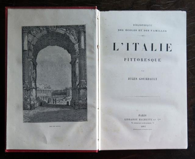 Paris, Hacette, 1883. In 4to piccolo, leg. coeva in tela rossa, dorso con ricchi fregi impressi a secco, fregi e oro sui piatti, pp. 316 con 88 bellissime illustrazioni silografiche, per lo più a piena pagina e con ampie vedute panoramiche di S. Marino, Vicenza, Padova, Pisa, Bellaggio, Riva del Garda, Pallanza, Milano, Moncalieri, Siena, Pistoia, Bologna, Lazio, Campania, Messina ed altre città della Sicilia. Un buon esemplare di questo bel libro illustrato da molte vedute.