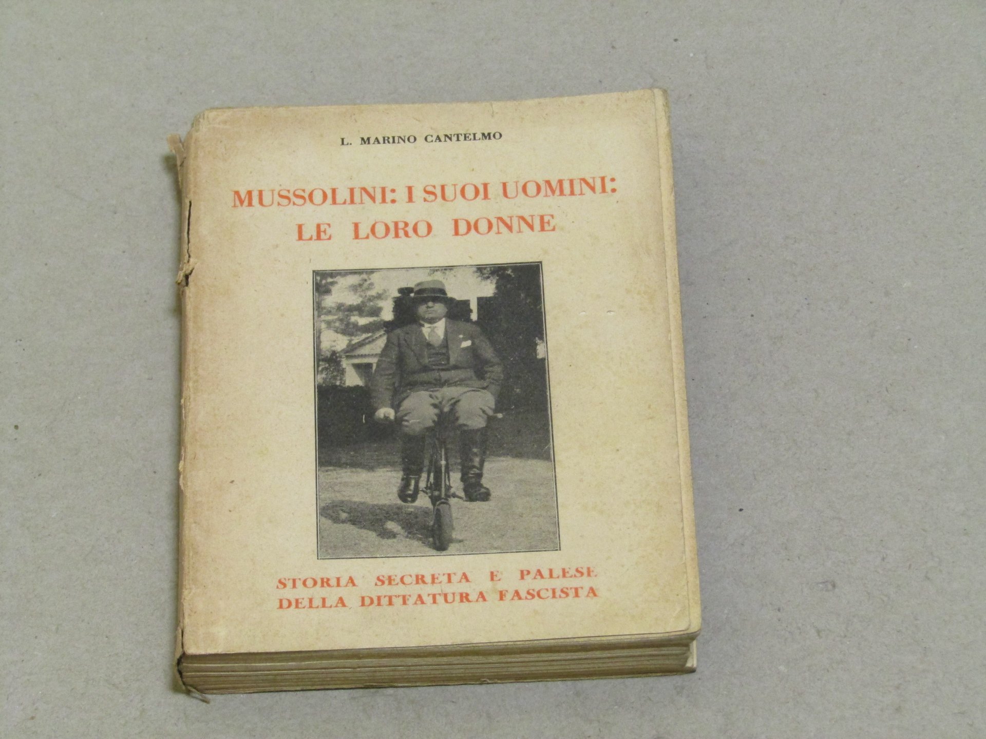 L. Marino Cantelmo L. Marino Cantelmo. Mussolini: i suoi uomini: le loro donne. Roma, Tipografia Agostiniana 1945 - I italiano, in sedicesimo pp.232 Saggio in cui viene narrata in modo negativo la storia del Fascismo. Copertina e pagine molto ingiallite. Pagine intonse. Copertina quasi staccata dalle pagine e molto strappata al dorso. Copertina e prime pagine con buichi di tarlo.