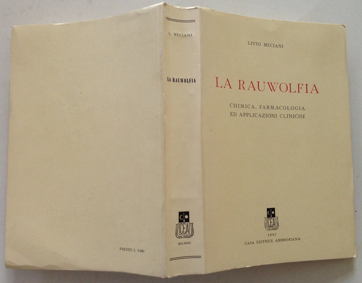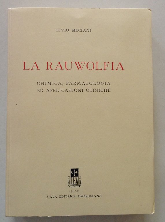 L. Meciani, La Rauwolfia chimica, farmacologia ed applicazioni cliniche Casa Editrice Ambrosiana, 1957; cm. 22x15,5; pp. 582; pecetto collocazione vecchia biblioteca al contropiatto anteriore; timbro omaggio alla prima e all'ultima bianca; con schemi e tabelle (anche fogli ripiegati); br. ed. Condizioni di conservazione Esemplare in buono stato con leggere tracce d'uso. SETT171.L15496 MT