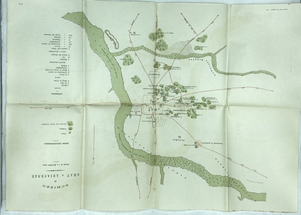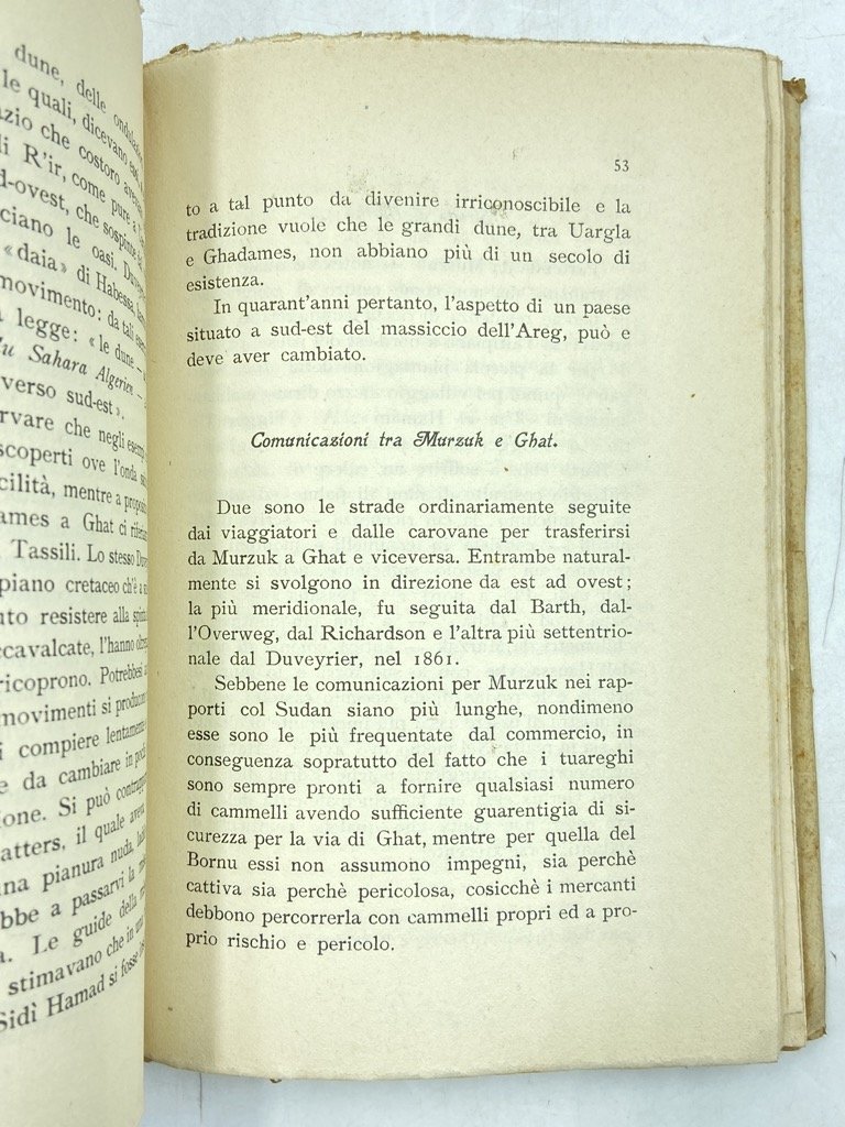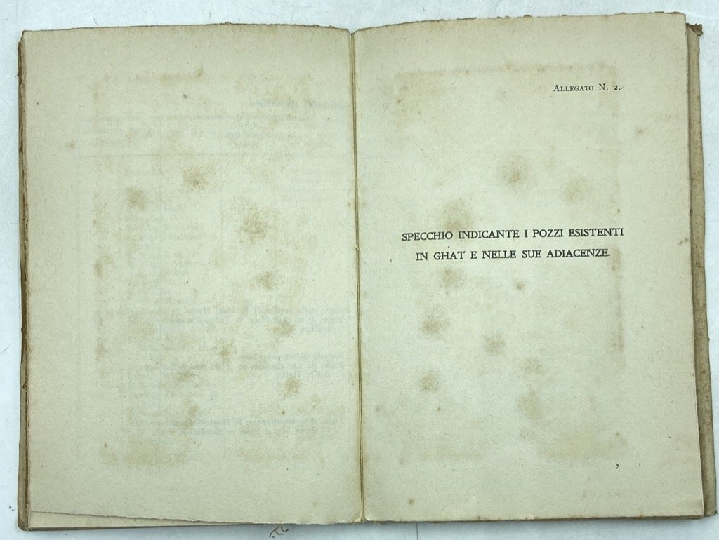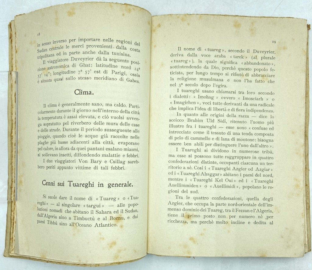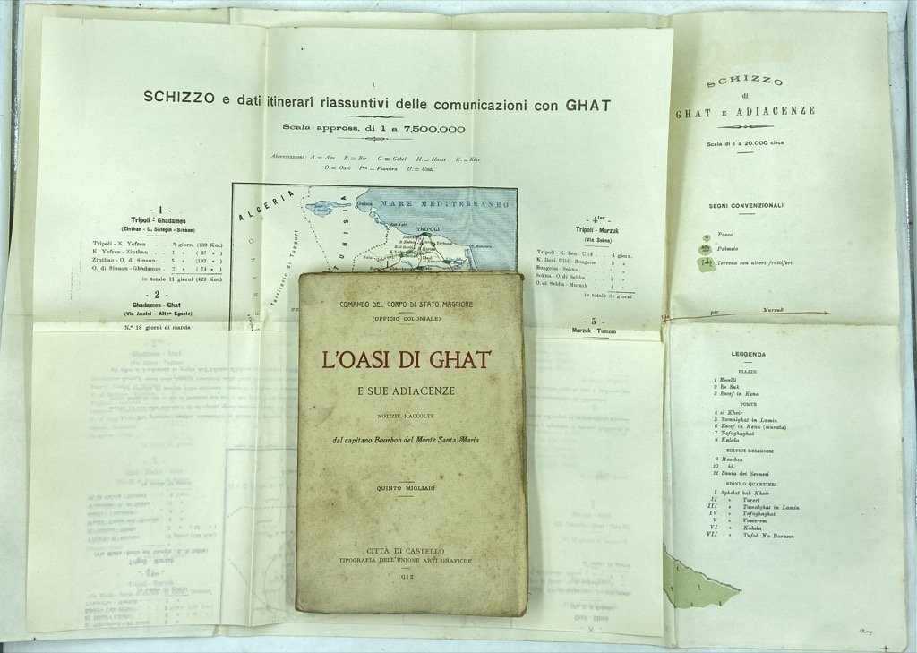 Brossura editoriale a stampa, cm 18.5 x 12.5, pp (4) 176 (2) con due schizzi geografici allegati. Brossura un po' brunita, qualche ossidazione in particolare alle pp. 98 e 99 ove era conservata una fotografia, peraltro buon esemplare. Agile volumetto pubblicato alla fine della guerra italo-turca dall’Ufficio Coloniale del Comando di Stato Maggiore, con notizie sulla città di Ghat e i suoi dintorni nel Fezzan. Il compilatore, capitano Bourbon Del Monte Santa Maria, raccoglie notizie sull’oasi, le risorse minerarie e naturali, le vie di comunicazione con Gadames, Murzuk, il Sahara e il Sudan, i commerci, ecc; presenti alcune note sui costumi della popolazione locale, sui tuareg, sulla dominazione ottomana. In appendice, glossario di termini arabi, berberi e tebu di carattere geografico militare (compilato da Giuseppe e Filippo El Ghazen), e un sintetico quadro di vocaboli botanici; sciolte e ripiegate in calce al volume due tavole ripiegate a colori con uno schizzo geografico 1:20000 di Ghat e adiacenze e una carta geografica delle vie di comunicazione.