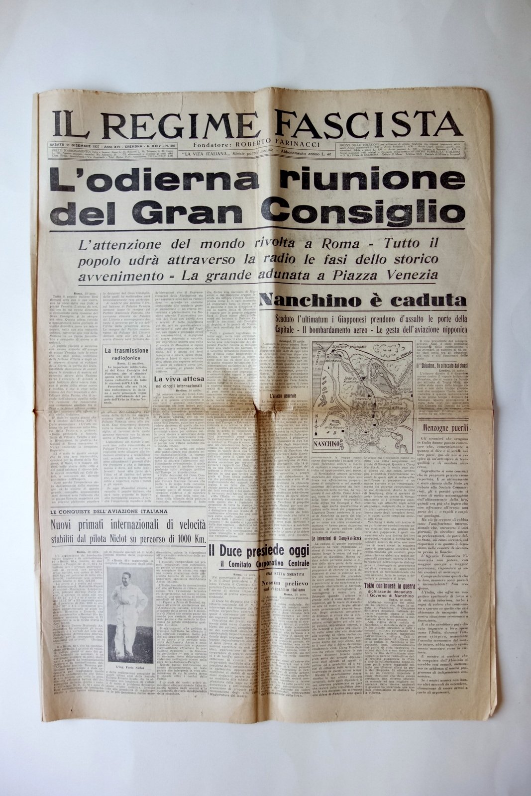Giornale, L'odierna riunione del Gran Consiglio" in "Il Regime Fascista" anno XXIV - numero 295 Cremona, 11 dicembre 1937 Cremona 1937; cm 58,5x43,5; pp. 6 con qualche ill. in b/n. Completo. Condizioni di conservazione Buone condizioni con tracce d'uso, normali pieghe di conservazione, leggero ingiallimento dovuto al tipo di carta e alcune piccole lievi bruniture. Alcuni minimi strappetti ai margini e strappetto di qualche cm all'incrocio delle pieghe. Completo. SC03.D18208 N "