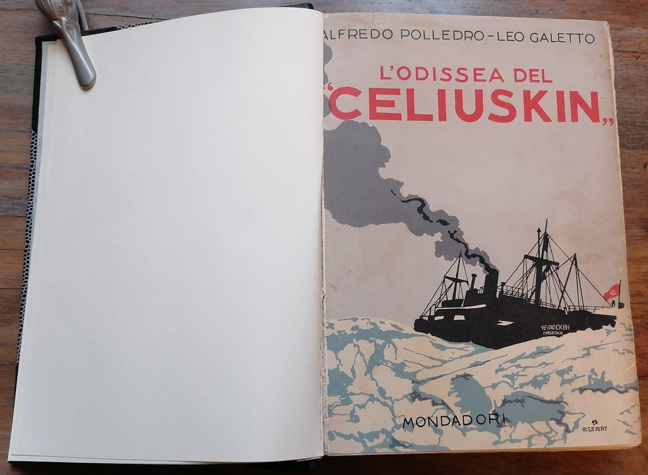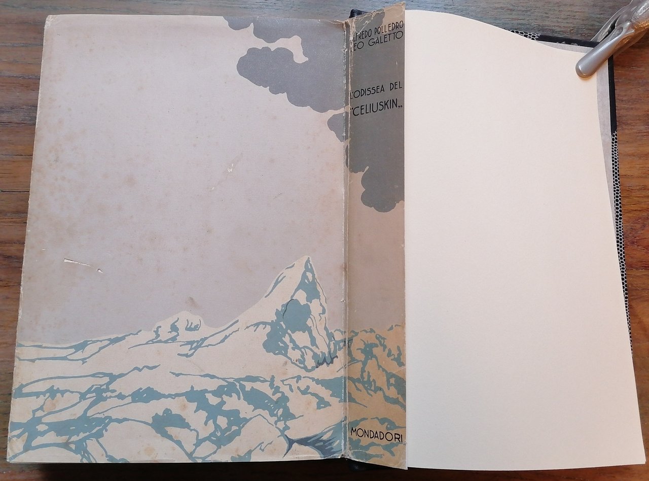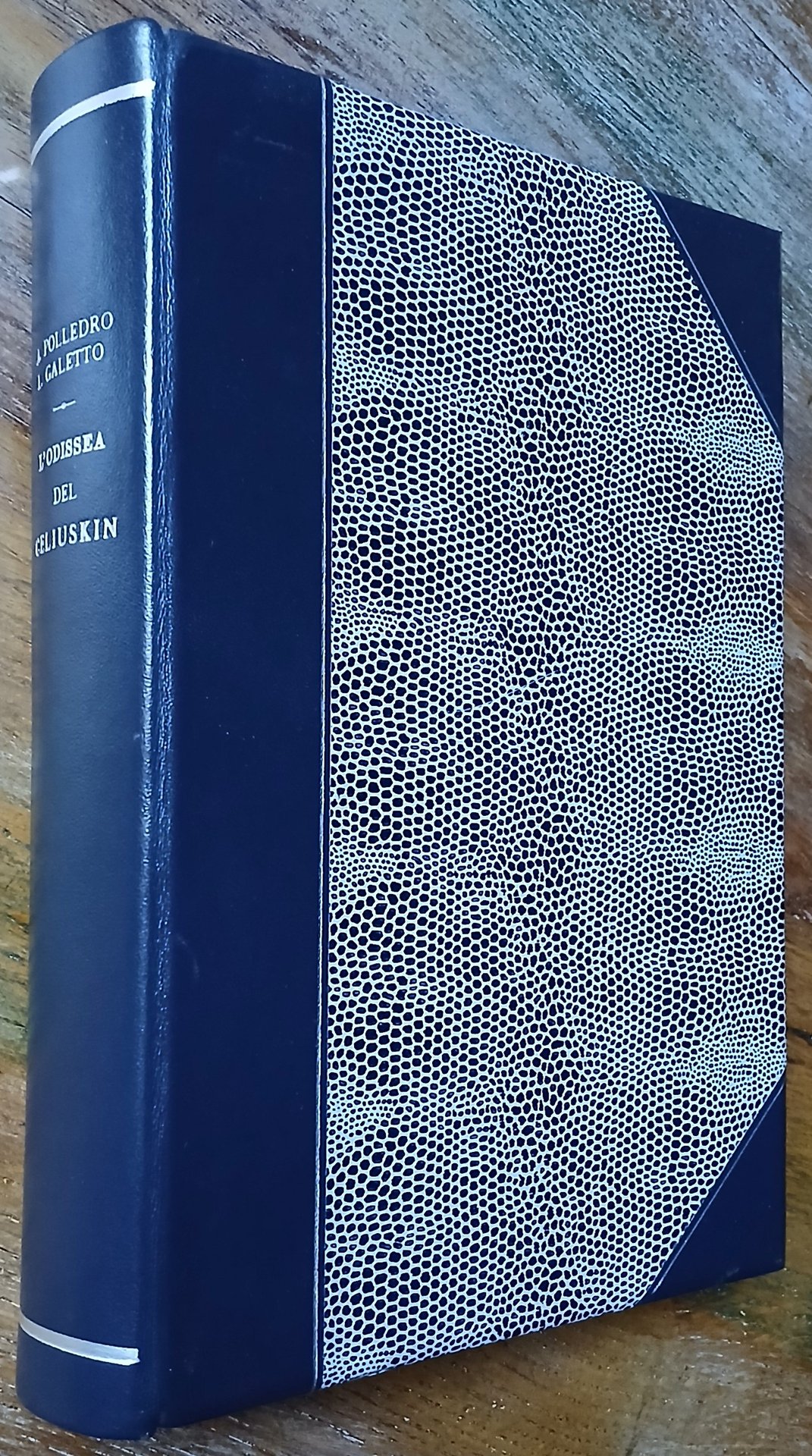 In 8°, legatura in mezza pelle blu con punte, al dorso titoli e filetti impressi in argento, ai piatti carta uso serpente blu e bianca, guardie in carta marmorizzata grigia, conservate la brossura muta e l'intera sovraccoperta editoriale illustrata a colori da Giulio Cisari, pp. XVI,239,(7), con fregi nel testo di Bruno Angoletta, 45 tavole fotografiche e 3 carte geografiche ripiegate fuori testo. L'impresa della nave russa 'Celiuskin', che spintasi lungo il passaggio Nord-Est, nell'Oceano Glaciale Artico, rimase imprigionata fra i ghiacci e sotto la pressione di questi affondò, lasciando i naufraghi sulla banchina polare per due mesi prima della difficile operazione di salvataggio da parte di un gruppo di aviatori. Ottimo stato di conservazione.