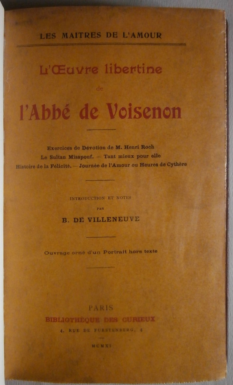 L'oeuvre libertine de l'Abbé de Voisenon. Exercises de Dévotion de M. Henri Roch / Le Sultan Misapouf / Tant mieux pour elle / Histoire de la Félicité / Journée de l´Amour ou Heures de Cythère.